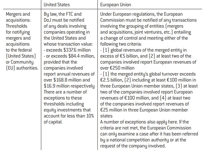 In the EU, mergers and acquisitions are examined and anticompetitive practices tackled through administrative decisions, while in the United States, the authorities (FTC or DoJ) or individuals bring antitrust cases before the civil or criminal courts10. Appendix 2 (d) provides a more comprehensive overview of the specificities of European and US antitrust law.