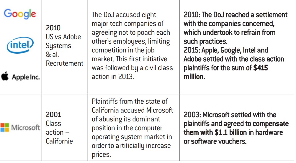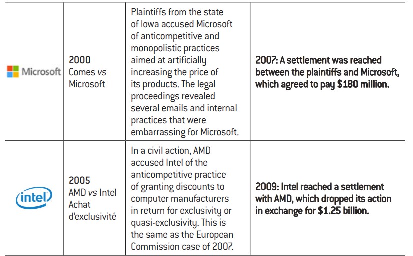 – one responsible for operating systems and the other for development and sales of other software components. The overturning of this judgement on appeal and the settlement subsequently reached between Microsoft and the DoJ are considered by many observers to be symbolic of the public authorities relinquishing their antitrust battle against the tech giants. Indeed, two decades later, it appears that very little has been done across the Atlantic by the federal agencies with regard to cases that they have taken on11. The main lawsuits seeking enforcement of antitrust laws have instead arisen from private complaints. Examples include the class action against Microsoft in California in 2001 for abuse of its dominant position in the computer operating system market, which saw the Redmond-based giant pay €1.1 billion in damages, or AMD’s legal action against Intel in 2005 for exclusivity payments, which forced Intel to accept a settlement including the payment of $1.25 billion in damages.
