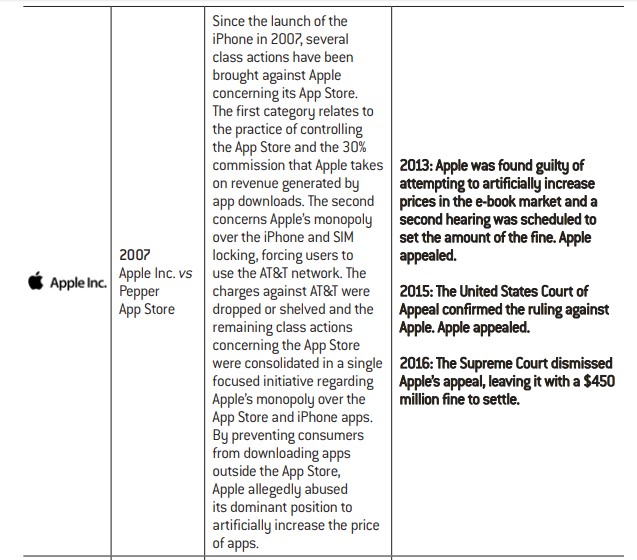 $450 million. Meanwhile in Europe, the European Commission investigated Amazon’s agreements with its publishers, which were alleged to prevent the emergence of a rival e-book platform. The European Commission and Amazon eventually settled and this was made legally binding in 2017. In a twist of fate, Apple was not publicly investigated in Europe regarding this matter and symmetrically, Amazon was not investigated in the United States. Even though competition laws differ in both economic areas, this example shows that some violations of competition rules have probably passed beneath the authorities’ radars.