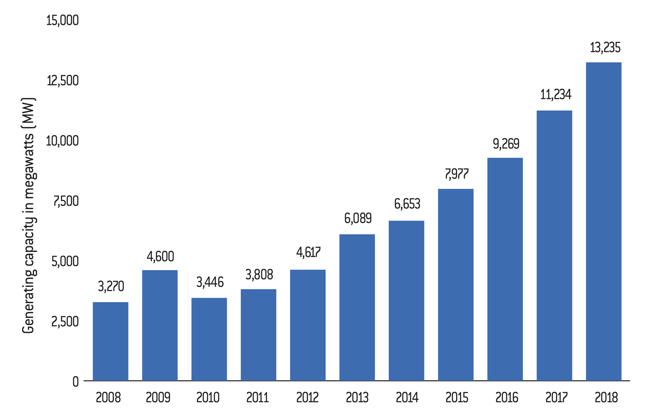 Total bioenergy production capacity in China between 2008 and 2018 (in megawatts)