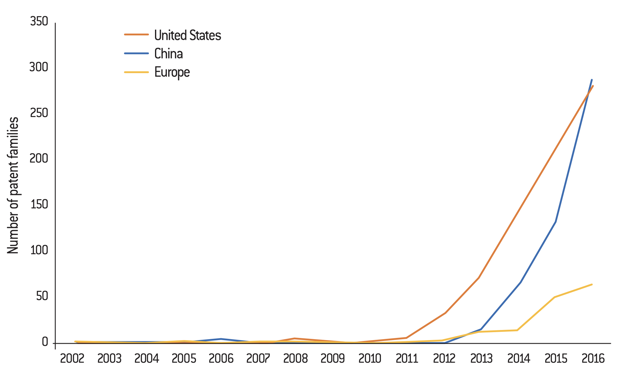 Evolution of the number of CRISPR patent families by geographical area (as of the earliest priority date, 2002 to 2016)