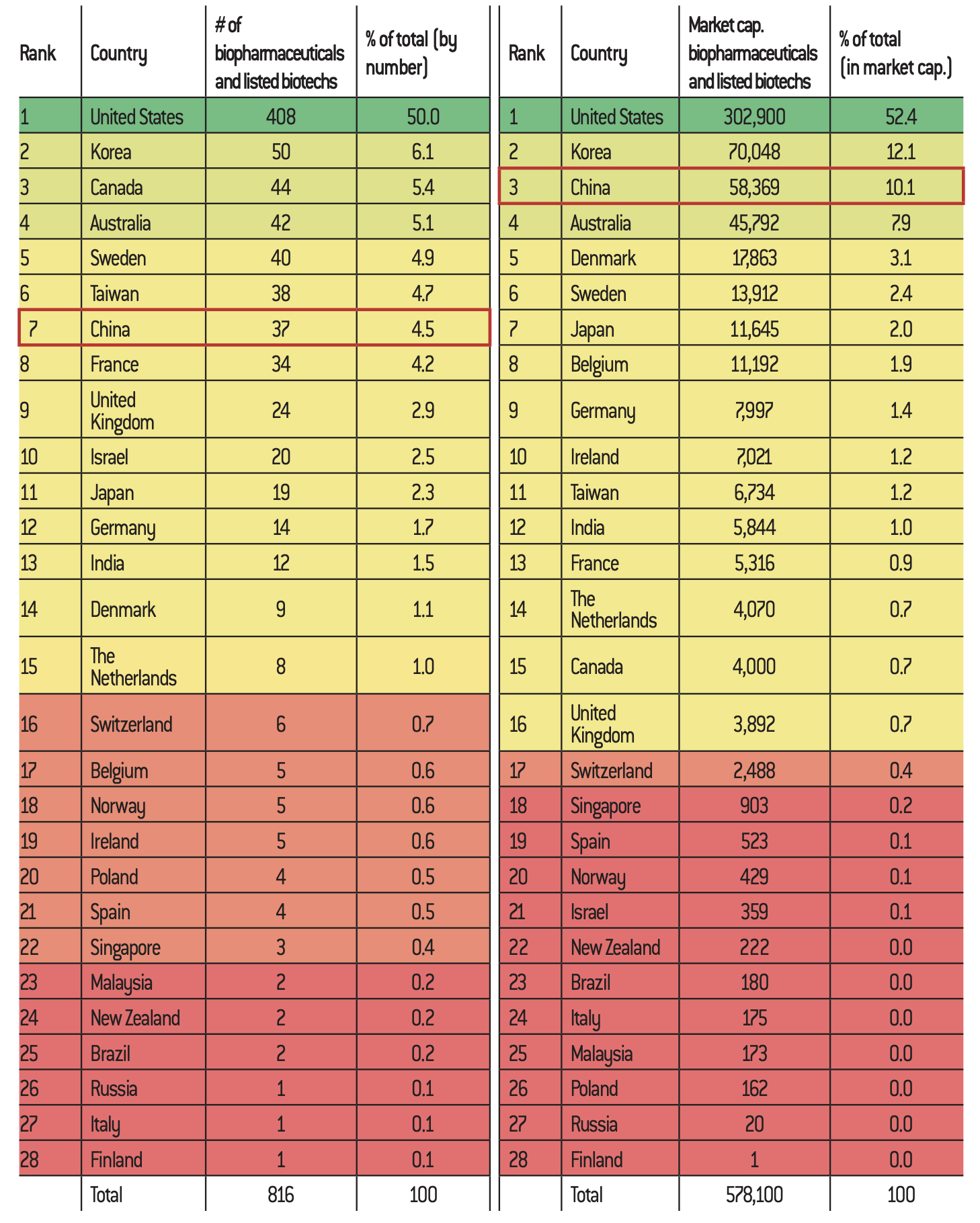 According to a recent study, 820 biotech companies worldwide are listed on the stock exchange, with a market capitalisation of $1,060 billion. Of these, 408 companies are American, accounting for 52% of the total valuation. The ten American giants alone account for $482 billion64, which shows an extreme concentration of the American market. Within this framework, their companies benefit from a favourable ecosystem in order to share resources and infrastructures. In comparison, only 37 Chinese companies appear on the list with a market capitalisation of 10.1% of the global level65, lower than that of South Korea. Nevertheless, compared to European companies, Asian companies seem to perform better: Korean and Chinese companies represent 1.5 times the total value of the 159 European biotech companies66.