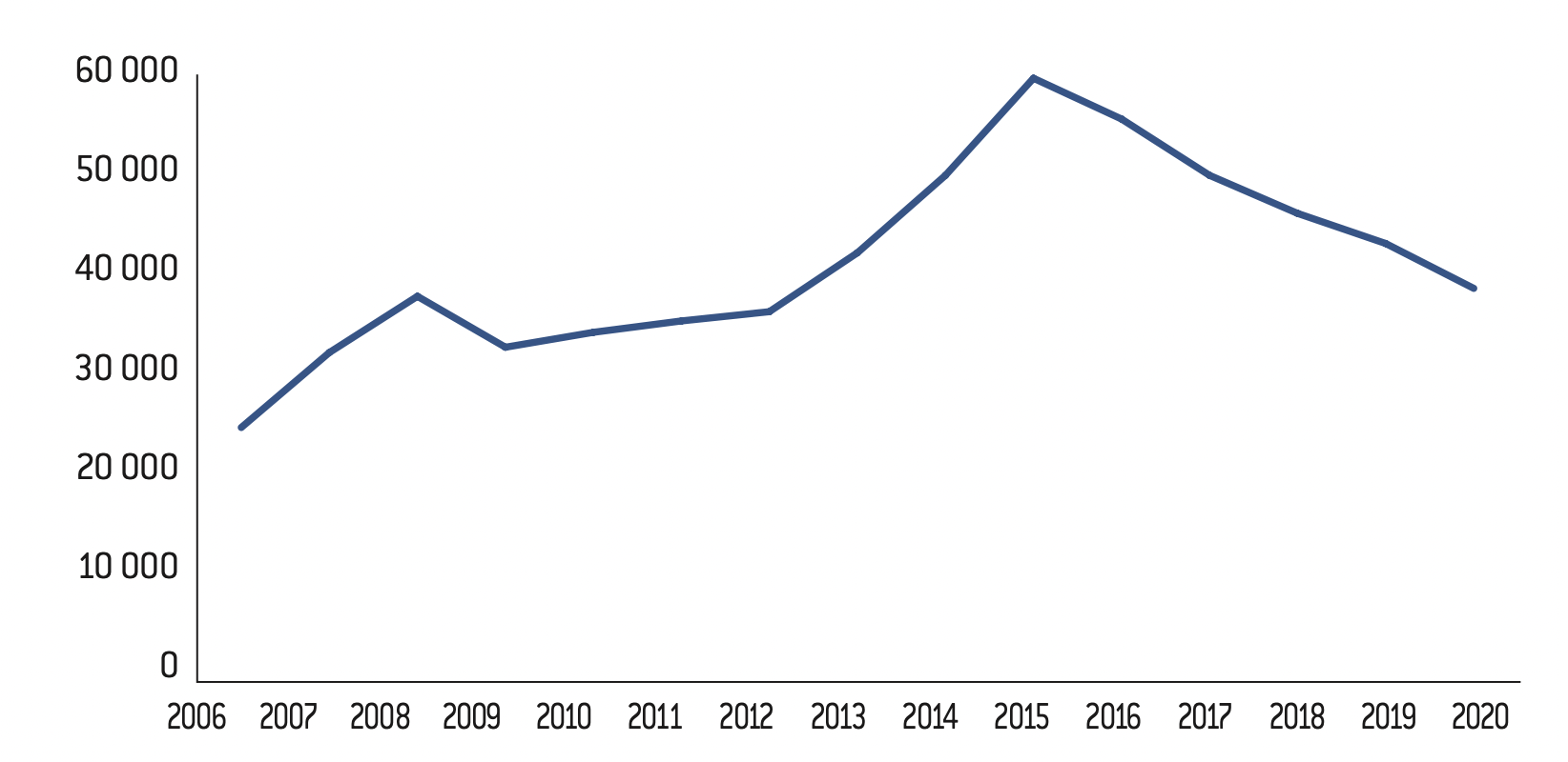 Annual immigration to Denmark, excluding asylum seekers (2006-2020)