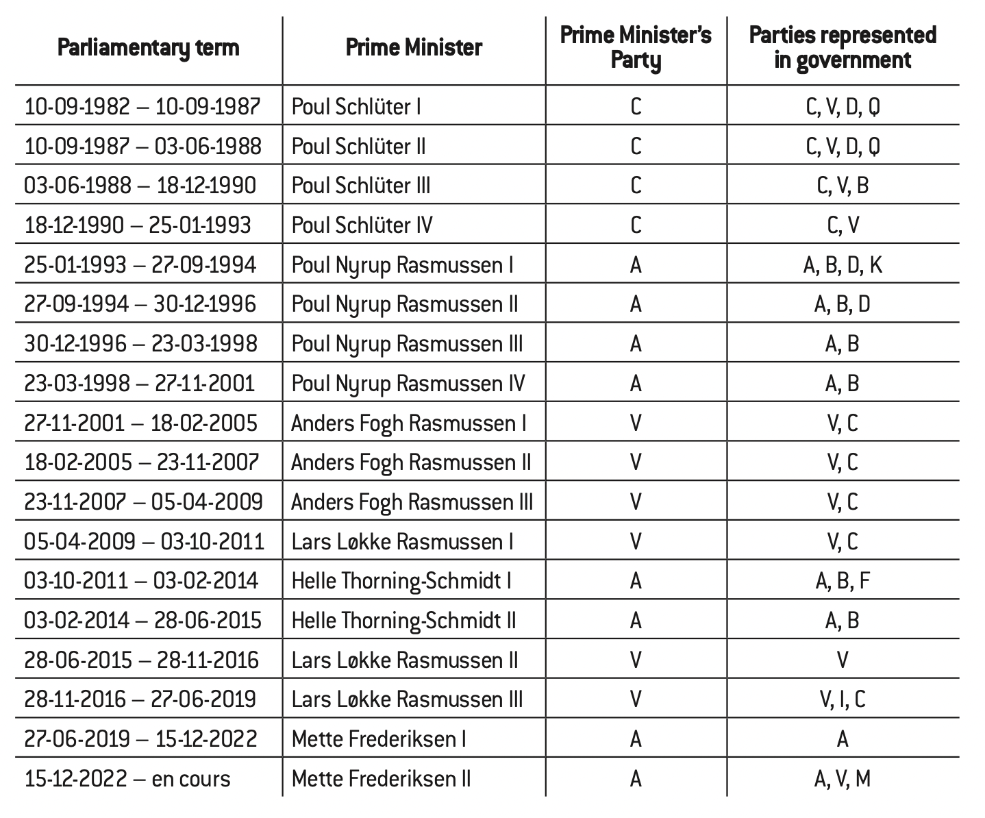 Note: Since 1945, Denmark has had thirty-eight governments, twenty-four of which were formed on the basis of a coalition and fourteen without a coalition.