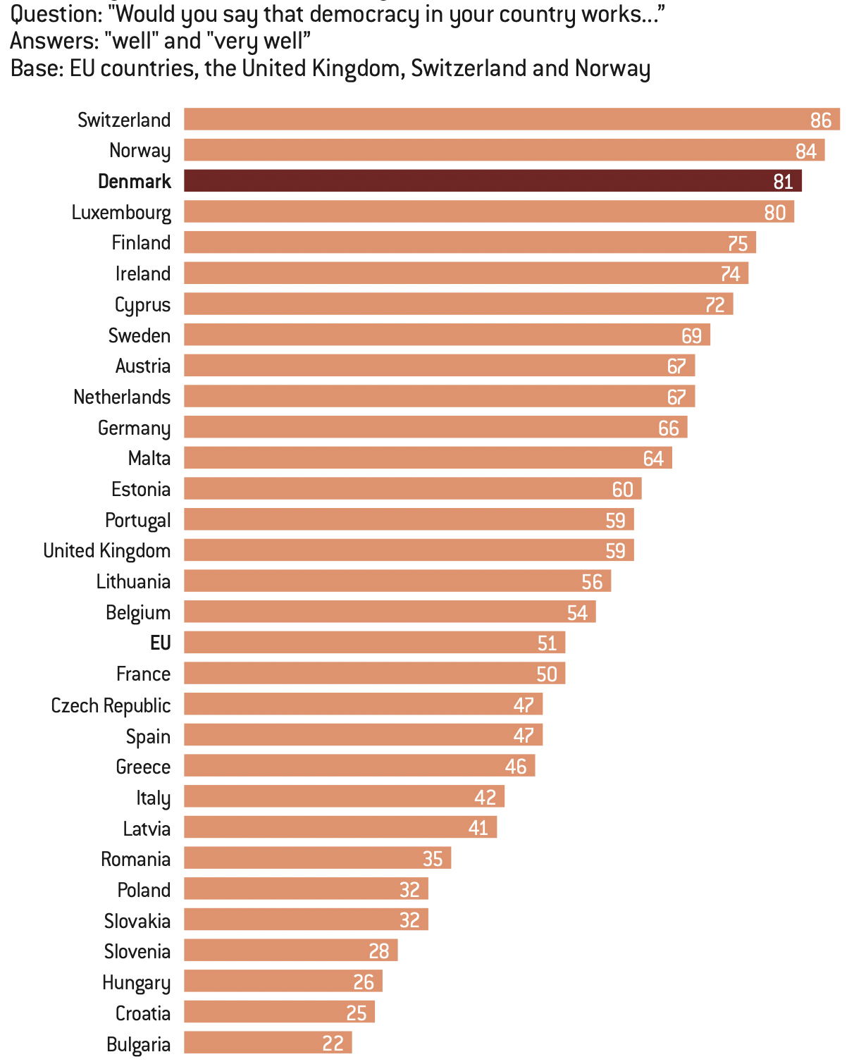 In the European Union, Danes are the most likely to consider that democracy works well in their country (in %)