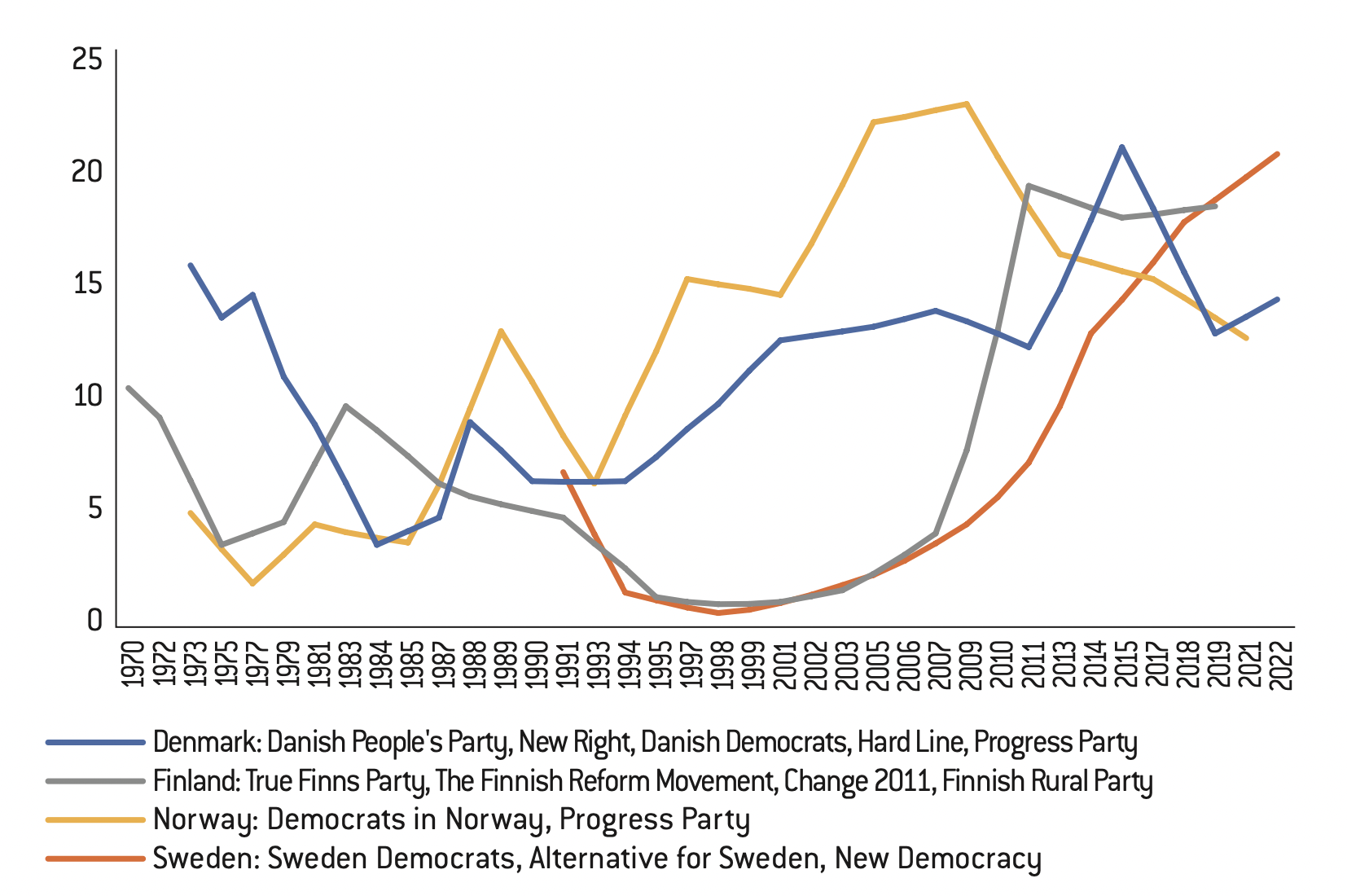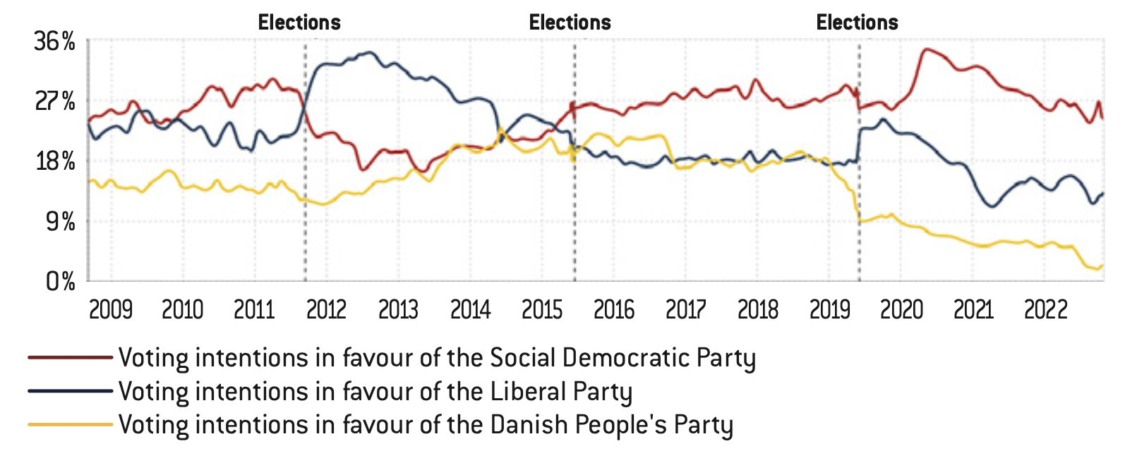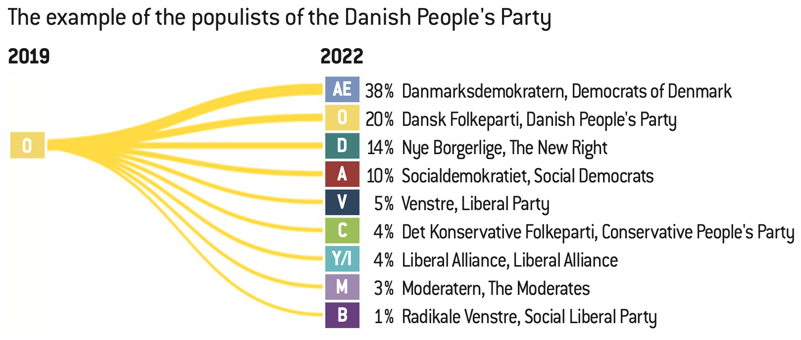 Note: Opinion data for the 2022 parliamentary elections show that 10% of voters who voted for the Danish People’s Party in 2019 responded in the October 27, 2022 poll that they would vote for the Social Democrats on November 1, 2022. Here we see the value of Danish parties combining the defense of the welfare state with a restrictive and integrative migration policy.