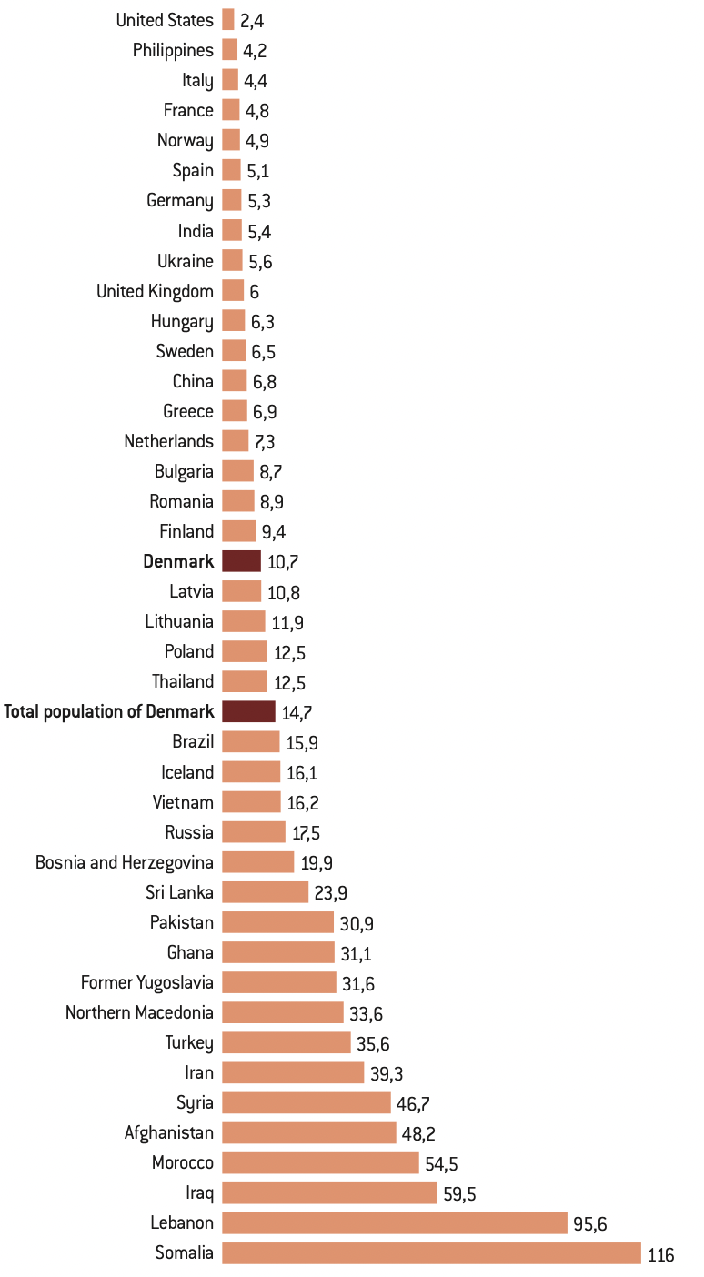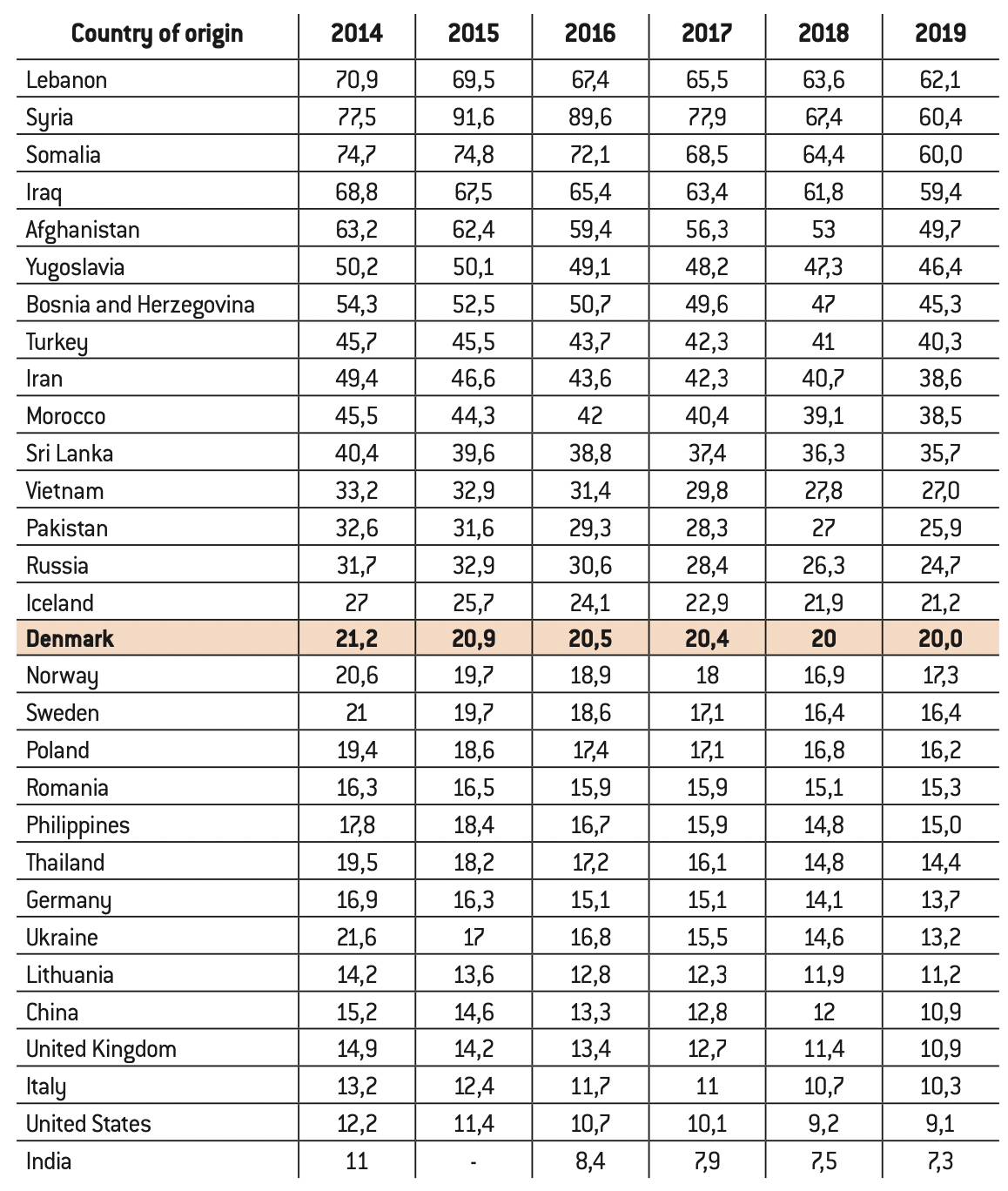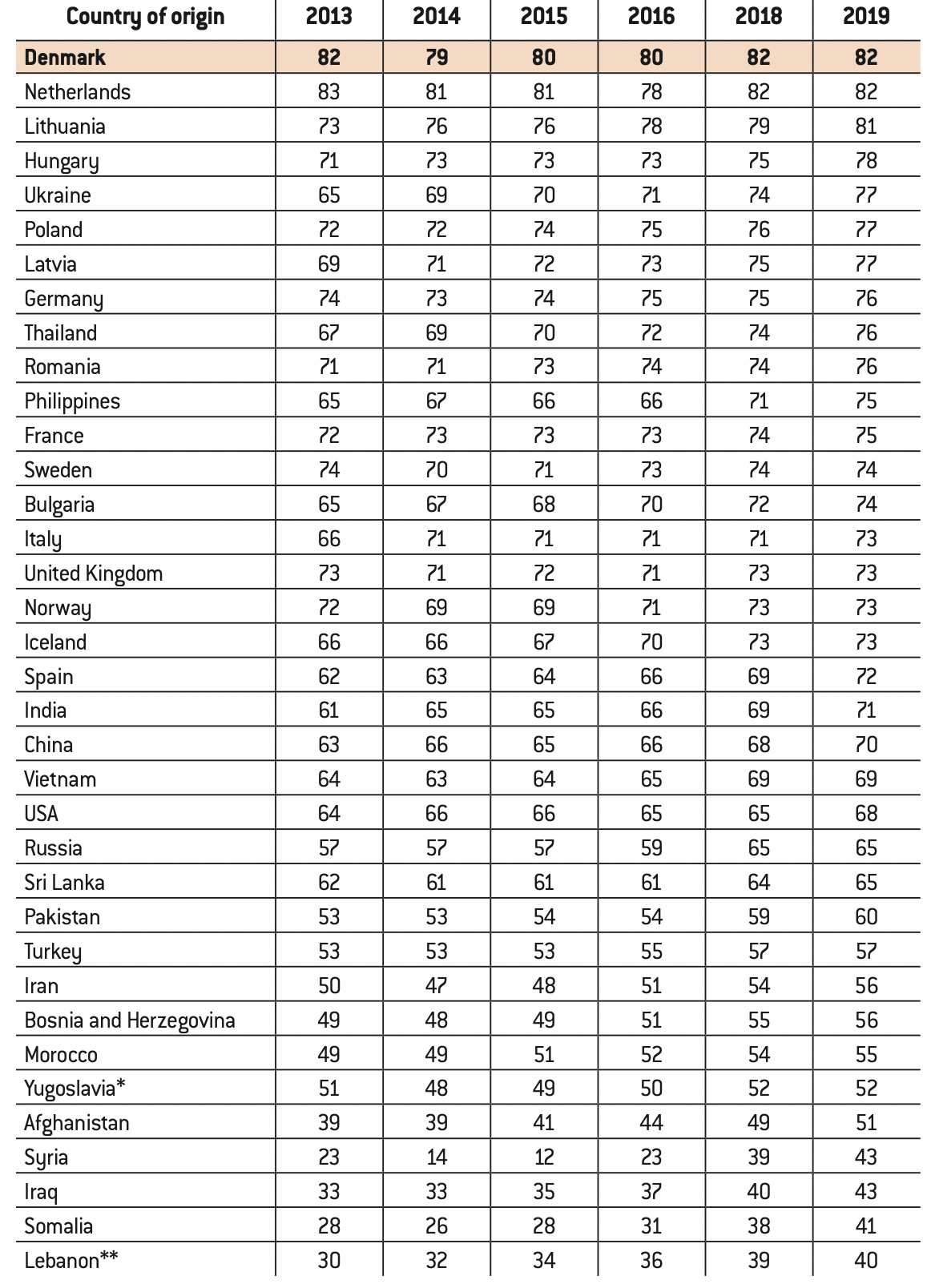 Criteria for registration of non-Danish nationals in Denmark’s population register: to be in possession of a residency permit and to wish to stay in the country for more than 3 months. The data presented refers to migrants living legally in Denmark, registered in the population register and residing in the country for at least one year. Excluded are: asylum seekers and other non- nationals with temporary residence status.
