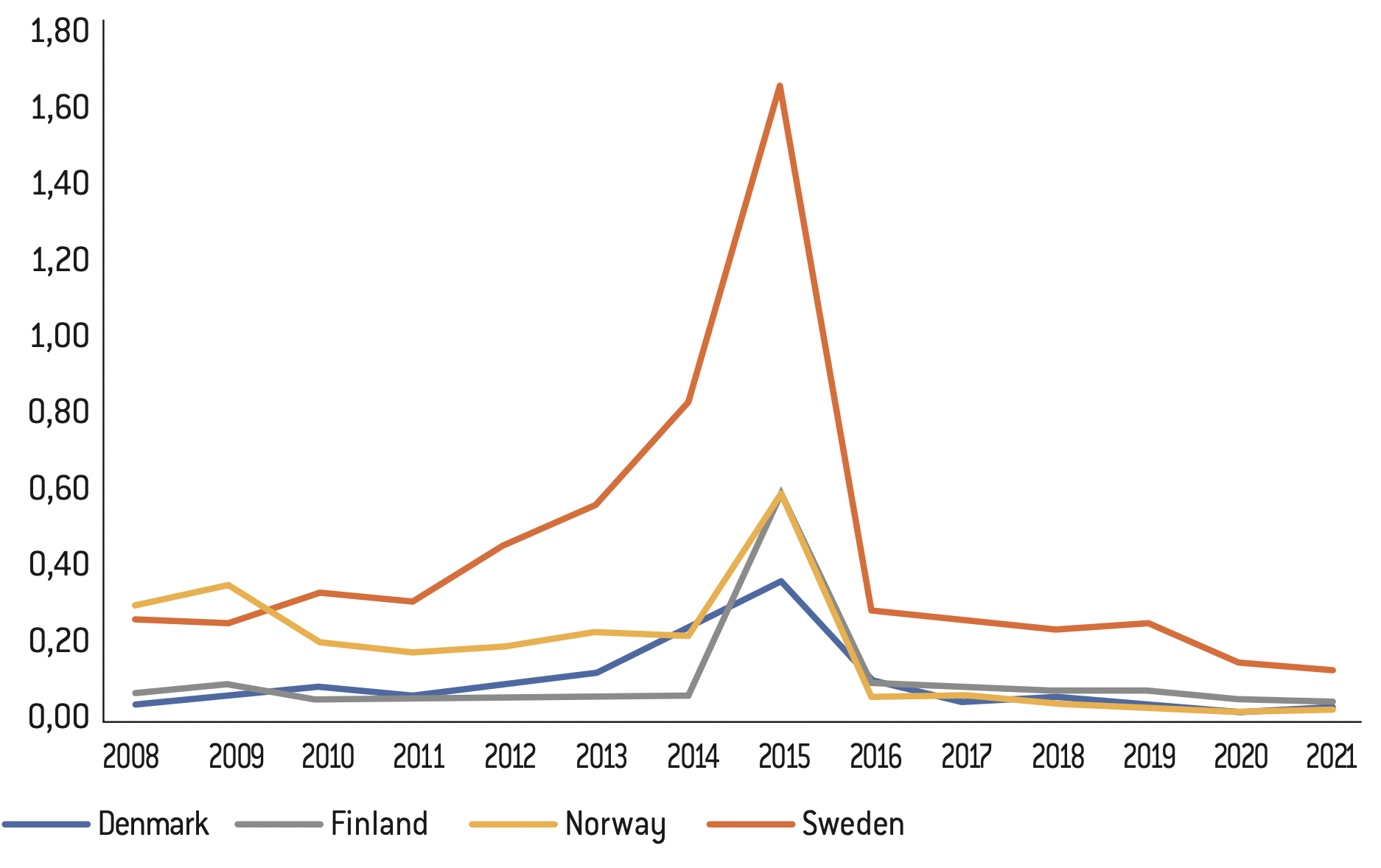 Number of asylum applications as a percentage of the total population (2008-2021, in %)