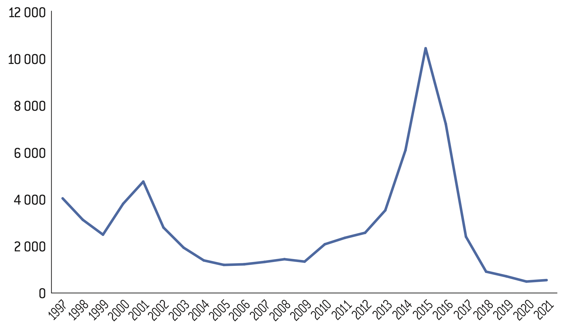 Over the past 20 years, Denmark has sought to restrict asylum applications by increasing the conditions for obtaining a permanent residence permit, tightening the conditions for family reunification of refugees, and ultimately discouraging asylum seekers from coming to Denmark. The pace of restrictions has accelerated since the 2015 migration crisis in Europe. Since then, more than 100 restrictions have been introduced by the Ministry of Immigration and Integration. More than half of these restrictions concern refugees. The many changes in laws and procedures and the bureaucratization of the system can also discourage asylum seekers from applying.61 Here, we present the main reforms, including the process of outsourcing asylum applications.