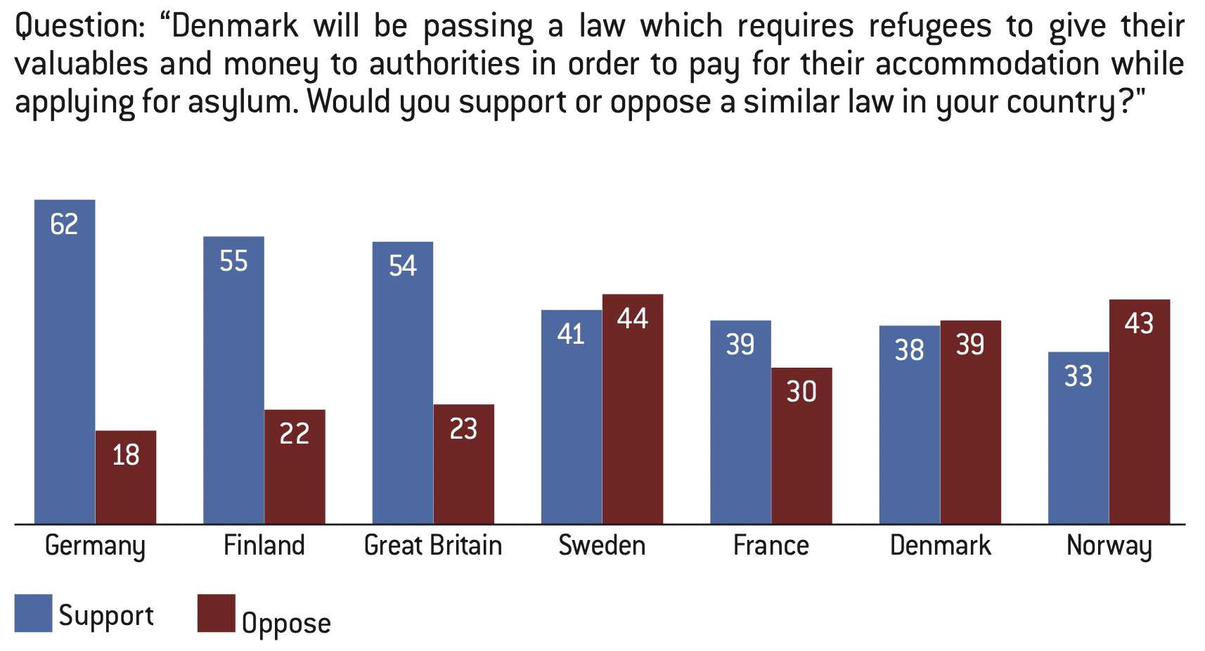 In 2016, the possibility of confiscating property belonging to asylum seekers was introduced to cover the costs of the procedure and accommodation. These new rules were highly publicized. This law, often referred to as the “Jewellery law”, transfers the financial responsibility for the arrival of their family under family reunification to the refugees, whereas the Danish state had previously been responsible for this. Although these measures sparked outrage in some parts of the public, they did not undermine Danish electoral support for a highly restrictive migration management policy.