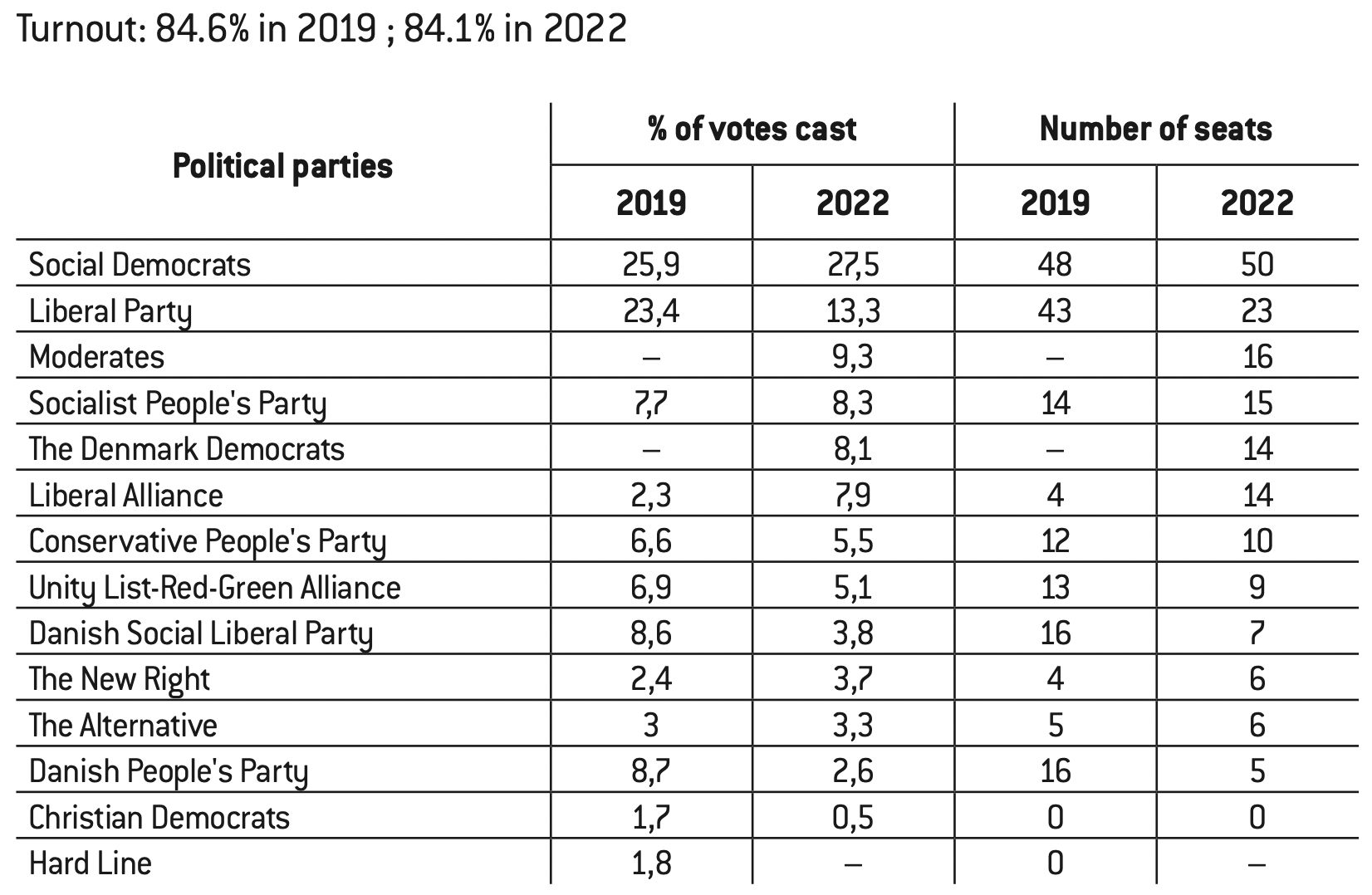 On November 1, 2022, the coalition of left-wing forces, called “Red Bloc”, came out on top in the Danish parliamentary elections84. The Social Democratic Party managed to stay in power, winning 27.5% of the vote and 50 of the 179 seats in the Folketing, two more than in 2019. The party remains by far the largest in the country.