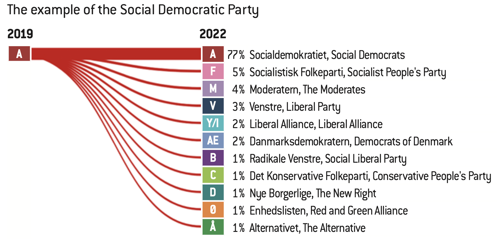 In 2022, the Danish People’s Party retains only 20% of its 2019 voters. Its electorate has split between the Social Democratic Party and competing populist parties: 38% of the Danish People’s Party’s voters in 2019 say they will vote for the new Danish Democrats in 2022, and 14% for the New Right.