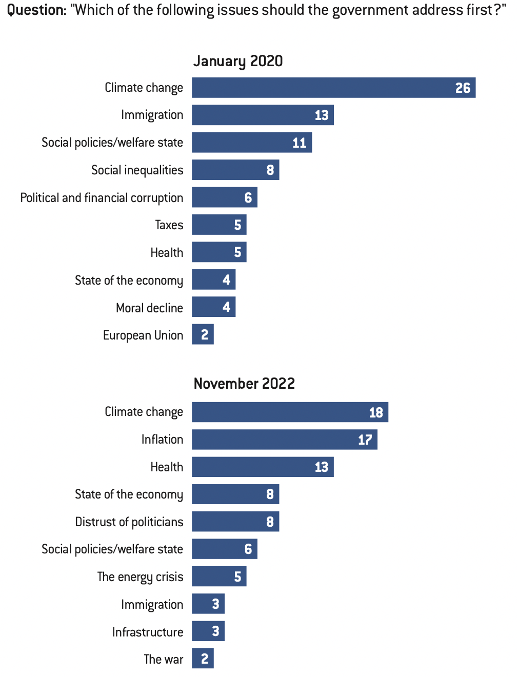 The opinion data provides some evidence of a consensus in favor of a restrictive and inclusive policy. Between January 2020 and November 2022, the issue of immigration shifted from second place to eighth place in the population’s concerns. Similarly, concern about social policies and the welfare state dropped from third place in January 2020 to sixth place in November 2022.