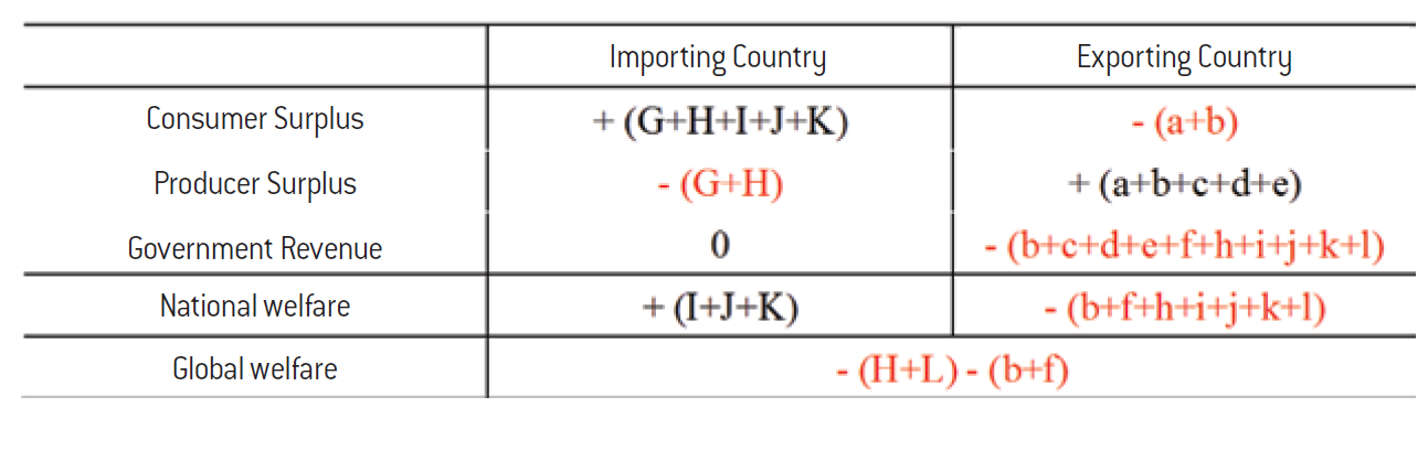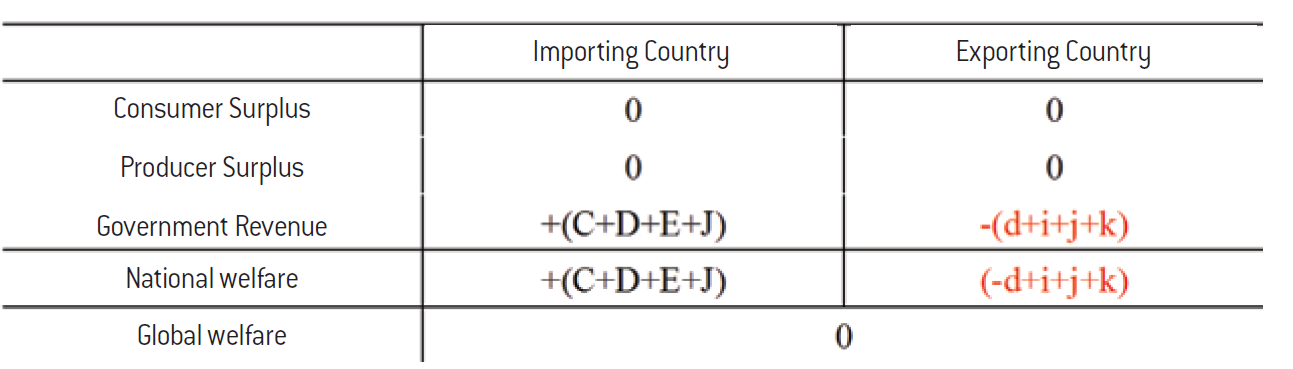 That being said, the decline in the producers welfare in the importing economy resulting from the foreign subsidy translates into a decrease in domestic production, a destruction of jobs, the potential closure of industrial sites, or even the liquidation of some companies. To counteract this, the government can decide to introduce a countervailing (or anti-subsidy) duty. As with the antidumping duty studied above, the countervailing duty has the effect of forcing prices in both markets to converge towards the price that would prevail in a free trade regime. The effects on consumers and producers are in fact opposite to those initially caused by the introduction of the subsidy, so that the cumulative impact of the subsidy and countervailing duty on the welfare of producers and consumers in each country is zero. On the other hand, the government of the importing country now collects customs revenue, while the government of the exporting country sees its budgetary expenditure related to the subsidy decrease as a result of the contraction in trade caused by the countervailing duty10.