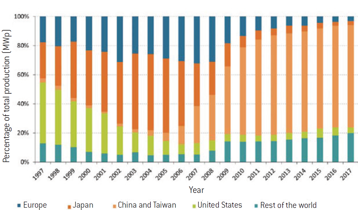 Historical production of photovoltaic modules worldwide (1997-2017)