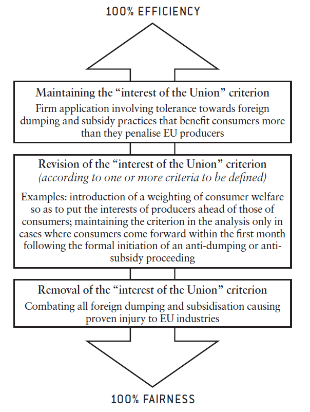 Revise the “interest of the Union” criterion. Finally, the discussion cannot end without mentioning the question of the “interest of the Union” criterion. This criterion requires the European Commission to prove that the introduction of anti-dumping or countervailing duties would not be to the detriment of the aggregate welfare of the European economy (see the second study in the series for a detailed description of this criterion)31. Currently, the European Union is an exception since very few WTO members include a public interest clause in their anti-dumping and anti-subsidy regulations32.