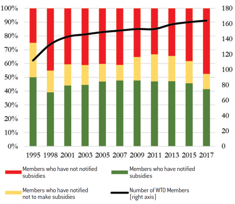 The supervisory pillar is undermined by the opacity of the policies of some Member States. In particular, the non-binding nature of subsidy notification requirements is problematic: the share of WTO members that do not comply with this notification requirement increased from 25% in 1995 to 48% in 201734. The role of the Chinese state-owned enterprises is regularly blamed: public companies contribute a quarter of GDP35 and nine of the ten largest listed companies in China (excluding Hong Kong) are state-controlled36. The strong influence of the Chinese Communist Party in economic affairs blurs the border between the public and private spheres37, which rightly fuels the concerns of China’s trading partners.