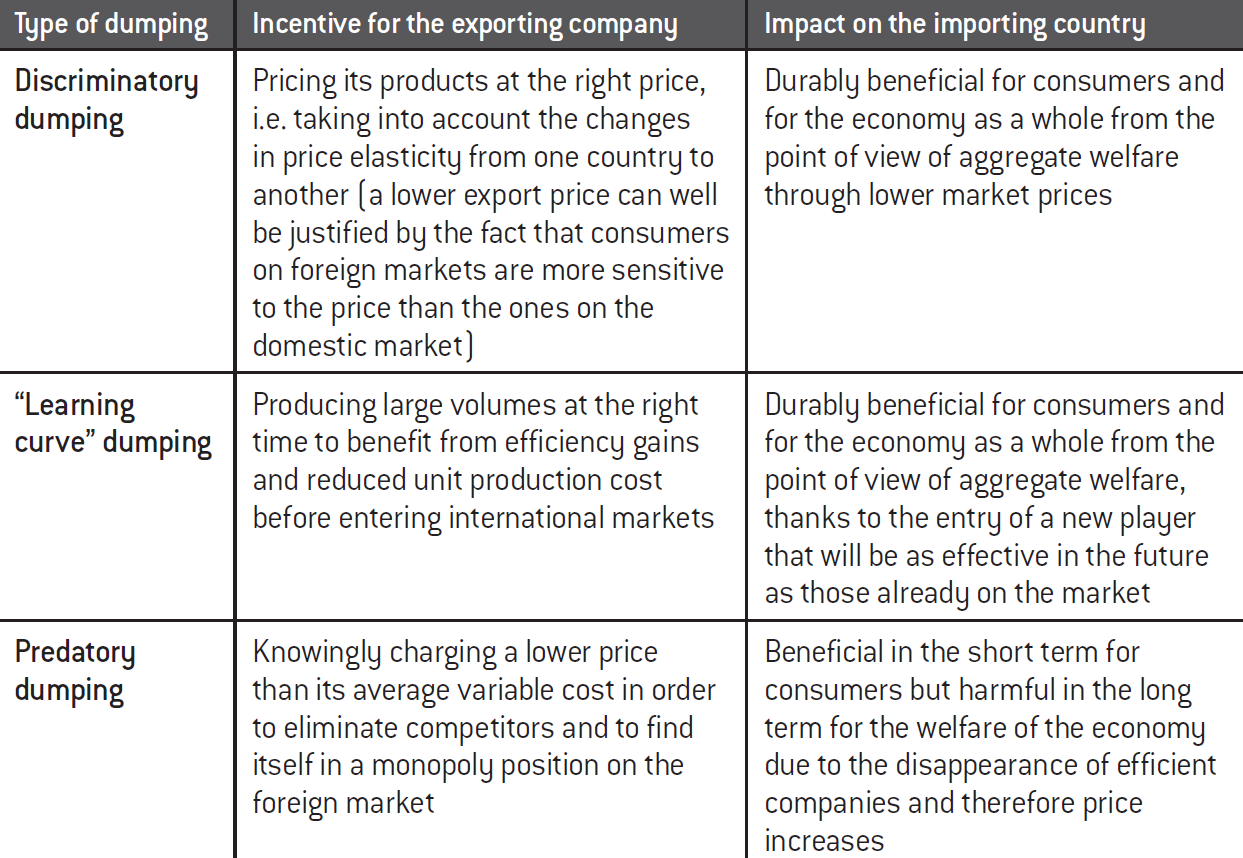 It should be recalled that in economics, the notion of “dumping” refers to when a company sells the same product at a lower export price than on its domestic market. At this stage, no normative conclusion can be reached as to whether or not such a practice is harmful. All depends on the motivation underlying the dumping practice. In this respect, several scenarios can be distinguished for the sake of the analysis.