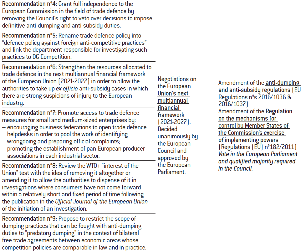 Recommendation nº9 : Propose to restrict the scope of dumping practices that can be fought with anti- dumping duties to “predatory dumping” in the context of bilateral free trade agreements between economic areas whose competition policies are comparable in law and in practice.