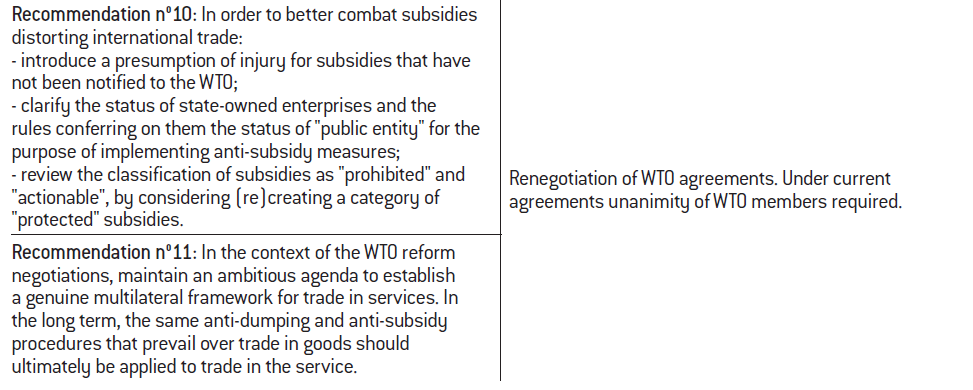 Recommendation nº11 : In the context of the WTO reform negotiations, maintain an ambitious agenda to establish a genuine multilateral framework for trade in services. In the long term, the same anti-dumping and anti-subsidy procedures that prevail over trade in goods should ultimately be applied to trade in the service.
