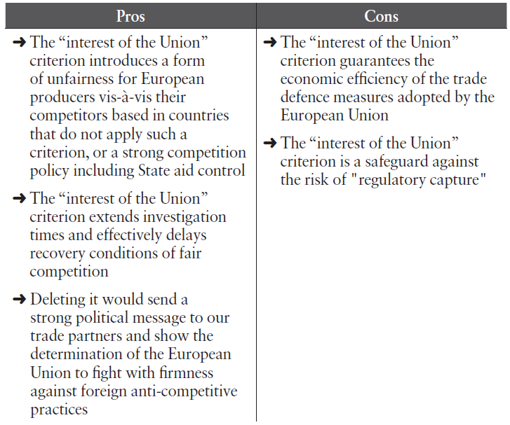 It is true that beyond the issue of positioning the cursor in arbitration between efficiency and fairness, the “interest of the Union” criterion increases the administrative burden that lengthens anti-dumping and anti-subsidies investigation and therefore delays the restoration of conditions of fair competition for producers. It mobilises resources from DG Trade that could be deployed on other cases. A revision or even the deletion of the EU’s interest criterion would have the merit of sending a strong political message to our trading partners regarding the determination of the European Union to fight firmly against unfair foreign competition.