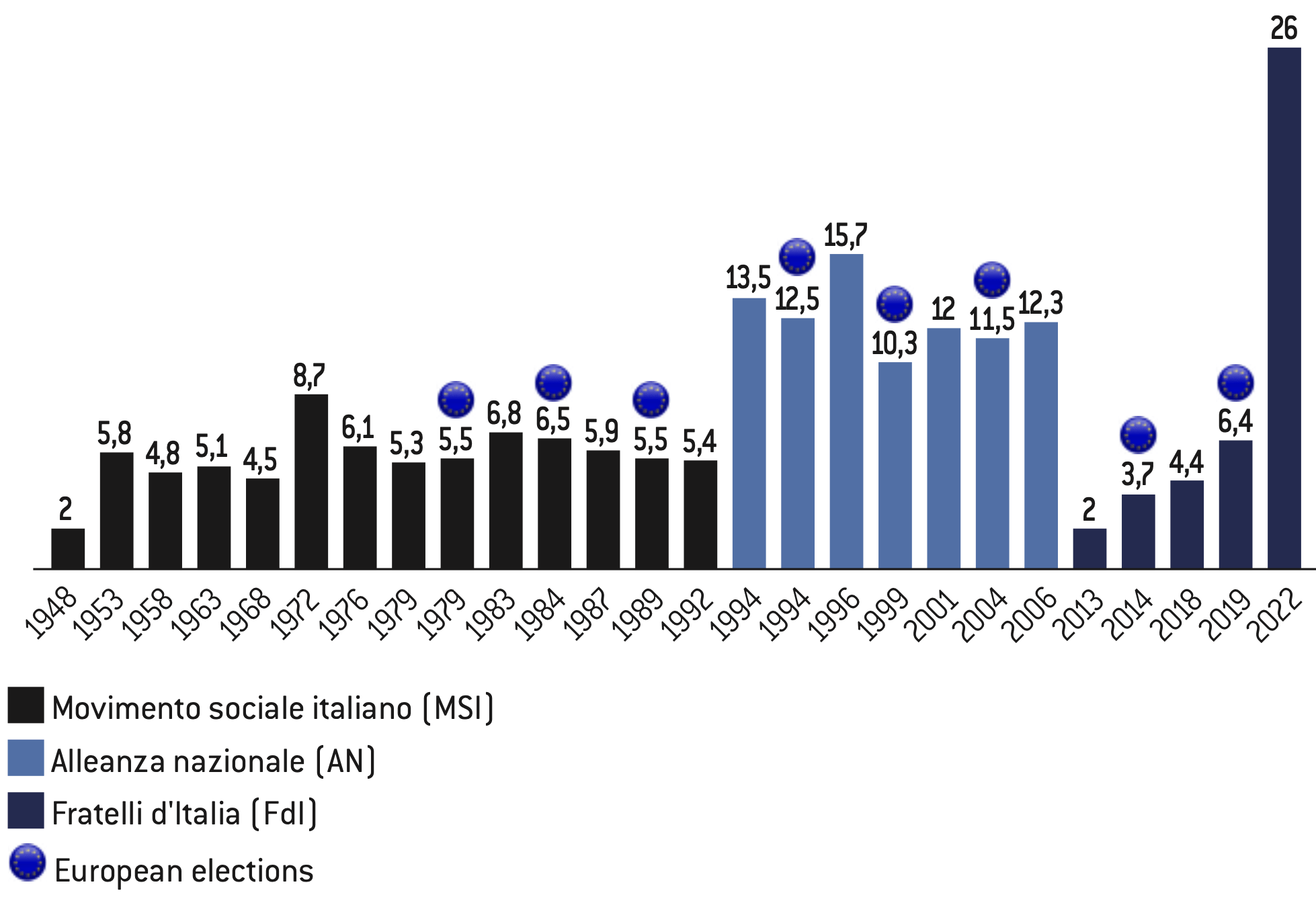 The protagonist of this new phase in the history of the Italian right is undoubtedly Fratelli d’Italia (FdI). In the space of four years, Fratelli d’Italia has risen from 4.4% to 26% of the vote in parliamentary elections. After a year in the government led by its leader, Fratelli d’Italia now has 30% of the The sincerity of this distancing of FdI, its leaders and activists from the fascist sympathies and nostalgia cultivated by many of those who had been active in the two previous “flame parties”, has been the subject of much debate since the new acronym appeared on the Italian political scene. Aware of the doubts that existed in this respect, Giorgia Meloni decided to publish her autobiographical book to clarify her vision of the world and her objectives. As mentioned above, the statements made by the party’s representatives and its official documents have been the subject of numerous analyses. The authors have arrived at different interpretations: there are those who have observed an evolution in relation to its neo-fascist past, those who have placed it – along with the Lega – in the family of the populist radical right, and those who continue to consider it extreme right-wing. Each of these interpretations contains interesting elements and considerations that deserve close examination. In order to verify the solidity of the whole, however, it is necessary to reconstruct, in a synthetic way, the course of this political formation up to the present day: a course which has been less linear than its supporters claim, and which has passed through different stages, marked by rather diversified positions.