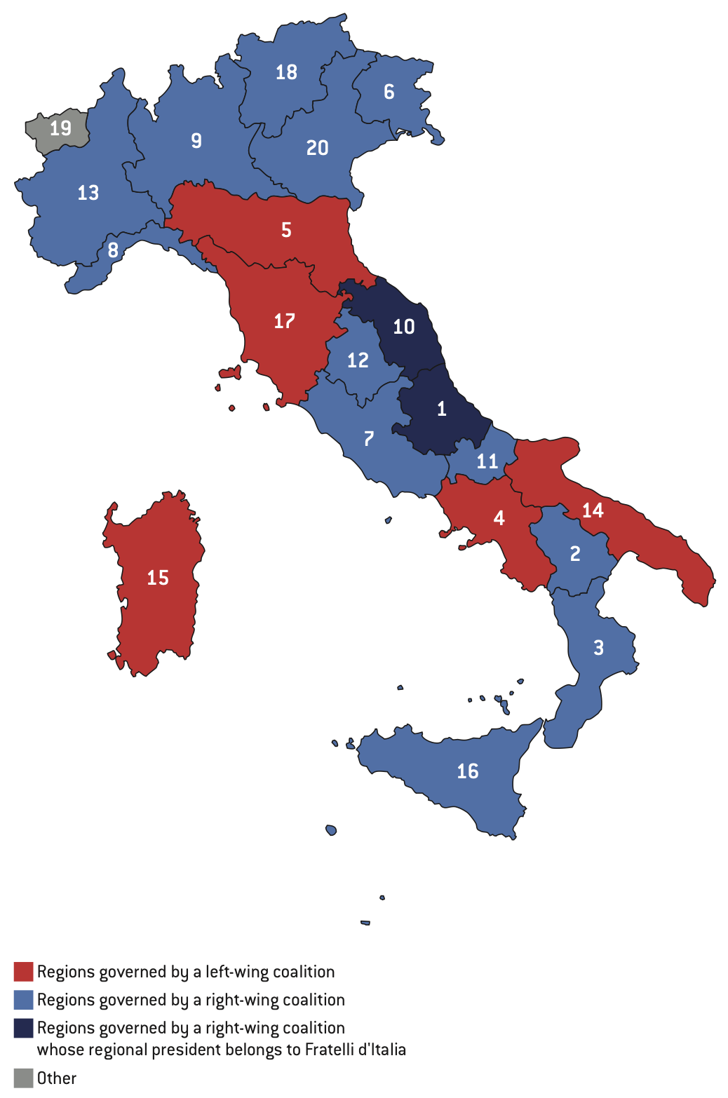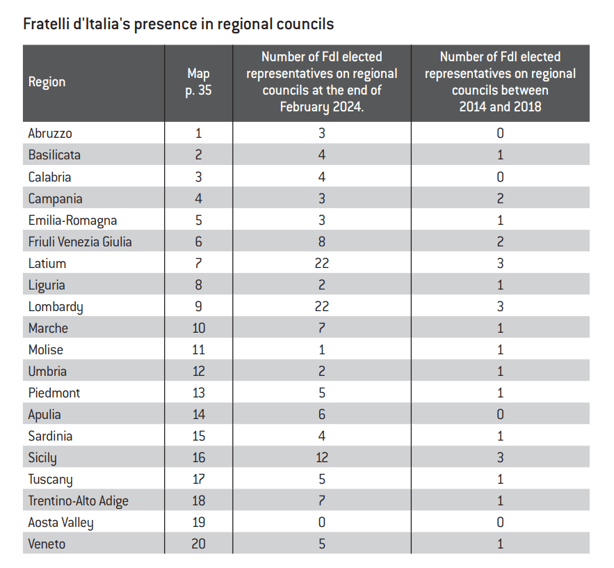 The same pattern is repeated, in simplified form, at local level, confirming the strongly hierarchical nature of the party, inherited from the tradition of the MSI and Alleanza Nazionale. As Vassallo and Vignati write, Fratelli d’Italia’s structure “is driven by the leader and the national executive”. The presidents and regional coordinations are structures dependent on this center: “they act in accordance with the movement’s national directives36“.