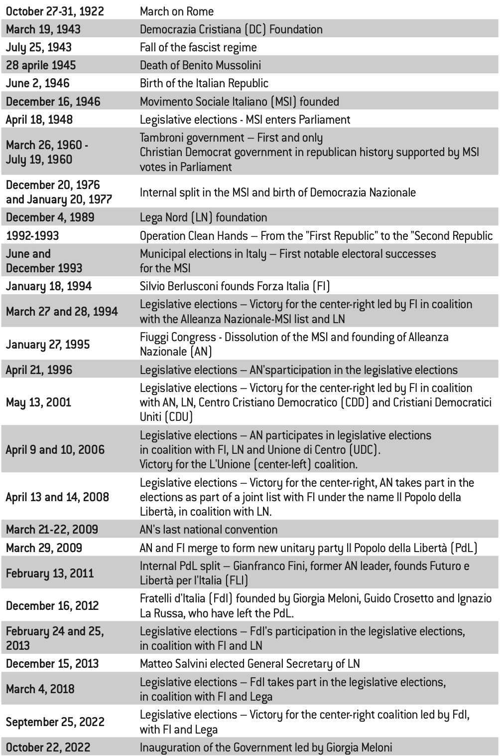 Another argument often cited in the debate on Fratelli d’Italia’s ideological connotations is the presence, in its symbol, of the tricolor flame, which the MSI adopted from the outset and which, despite strong internal debate and external pressure, Alleanza nazionale maintained until its leader Gianfranco Fini decided to dissolve it to merge into Popolo della libertà, the short-lived center-right single party wanted and led by Silvio Berlusconi. Even those who acknowledge the party’s evolution over its ten years of existence can’t help but notice that, again because of this characteristic, the FdI doesn’t fail to be described as “the third party of the flame”8 and therefore linked, to some extent, to the events of Italian neo-fascism. The assertion is undoubtedly acceptable, but to understand whether Fratelli d’Italia has succeeded in emancipating itself from the history to which it belongs, and, if so, how and why, it is necessary to examine the complex trajectory of its “ancestors” in post-war Italy.