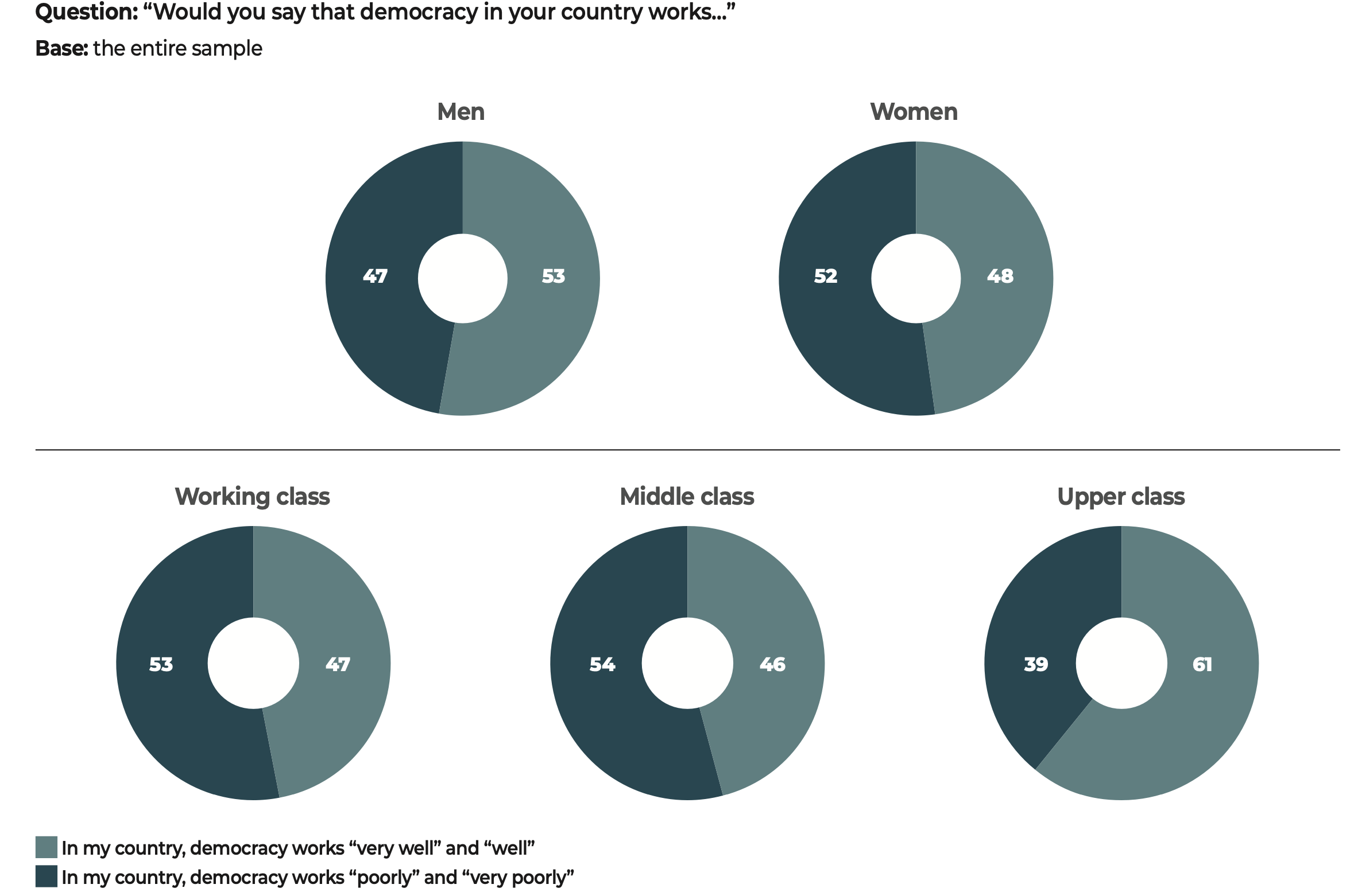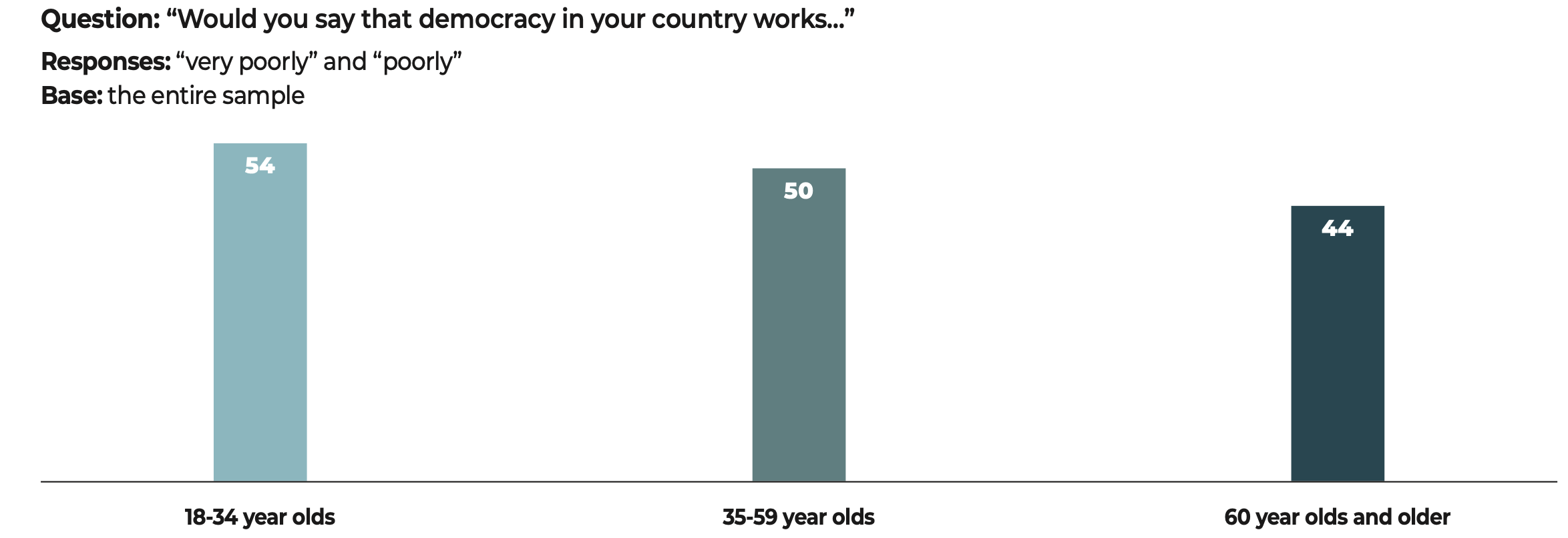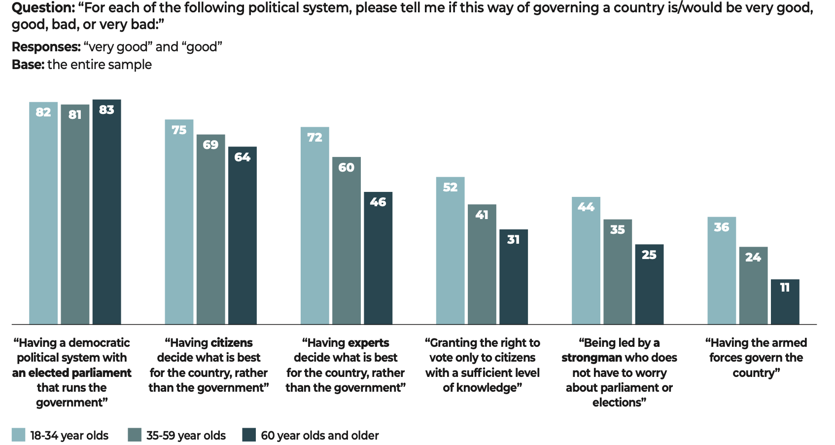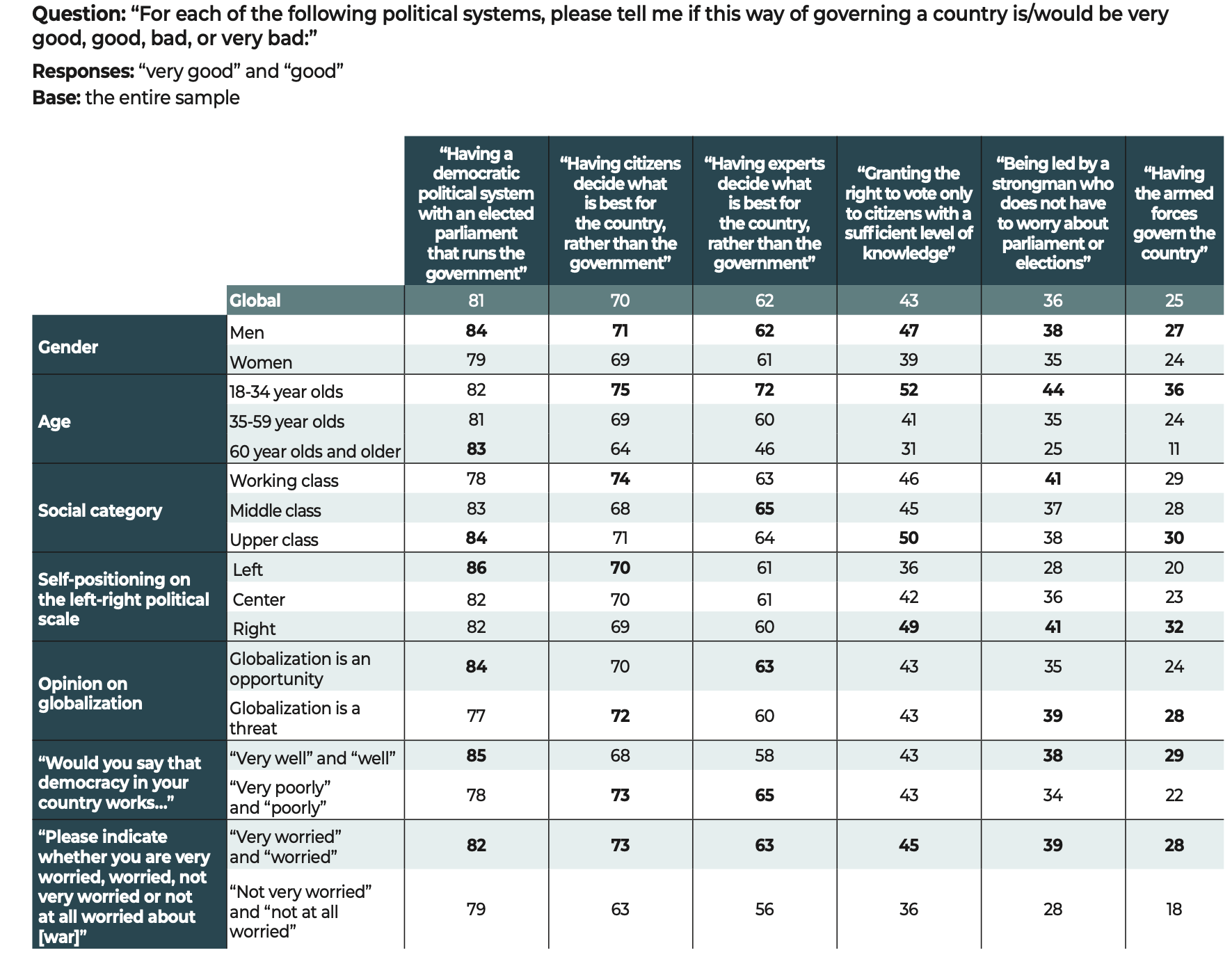 In the face of these major challenges, democratic societies still have one priceless asset that is illustrated in the results of our study. The citizens surveyed have confirmed their allegiance to freedoms and to democracy. Our data show that when they voice disapproval, more often than not, the object of their criticism is not the idea of democracy itself but rather the way in which democracy functions in their country.