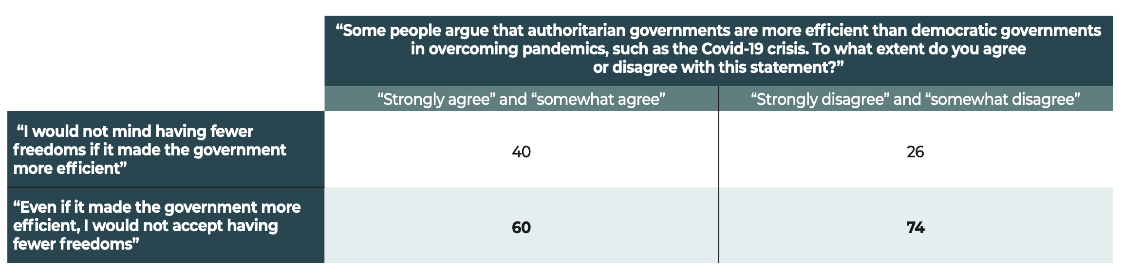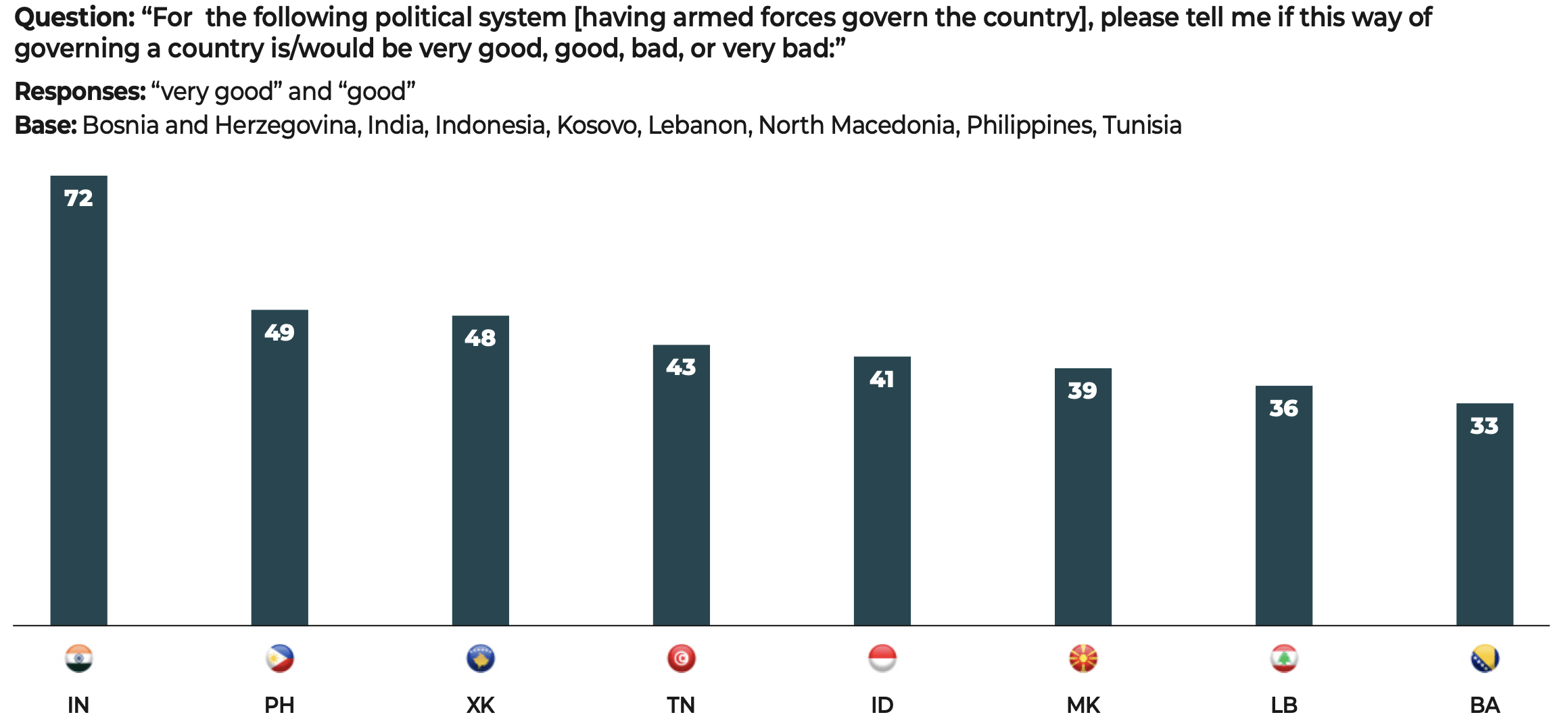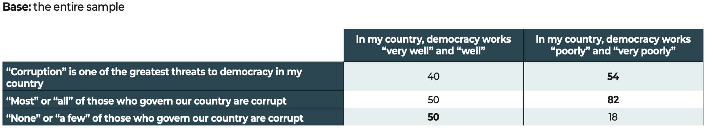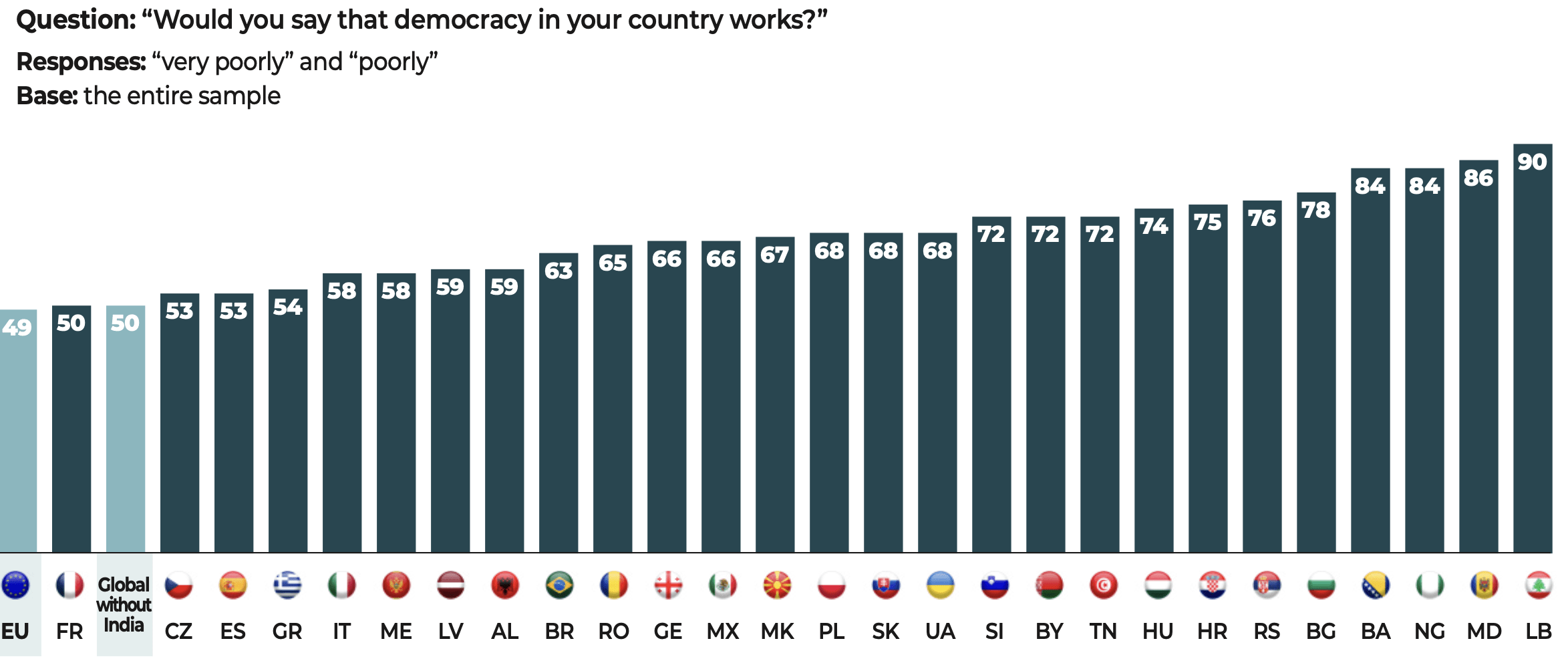In the face of these major challenges, democratic societies still have one priceless asset that is illustrated in the results of our study. The citizens surveyed have confirmed their allegiance to freedoms and to democracy. Our data show that when they voice disapproval, more often than not, the object of their criticism is not the idea of democracy itself but rather the way in which democracy functions in their country.