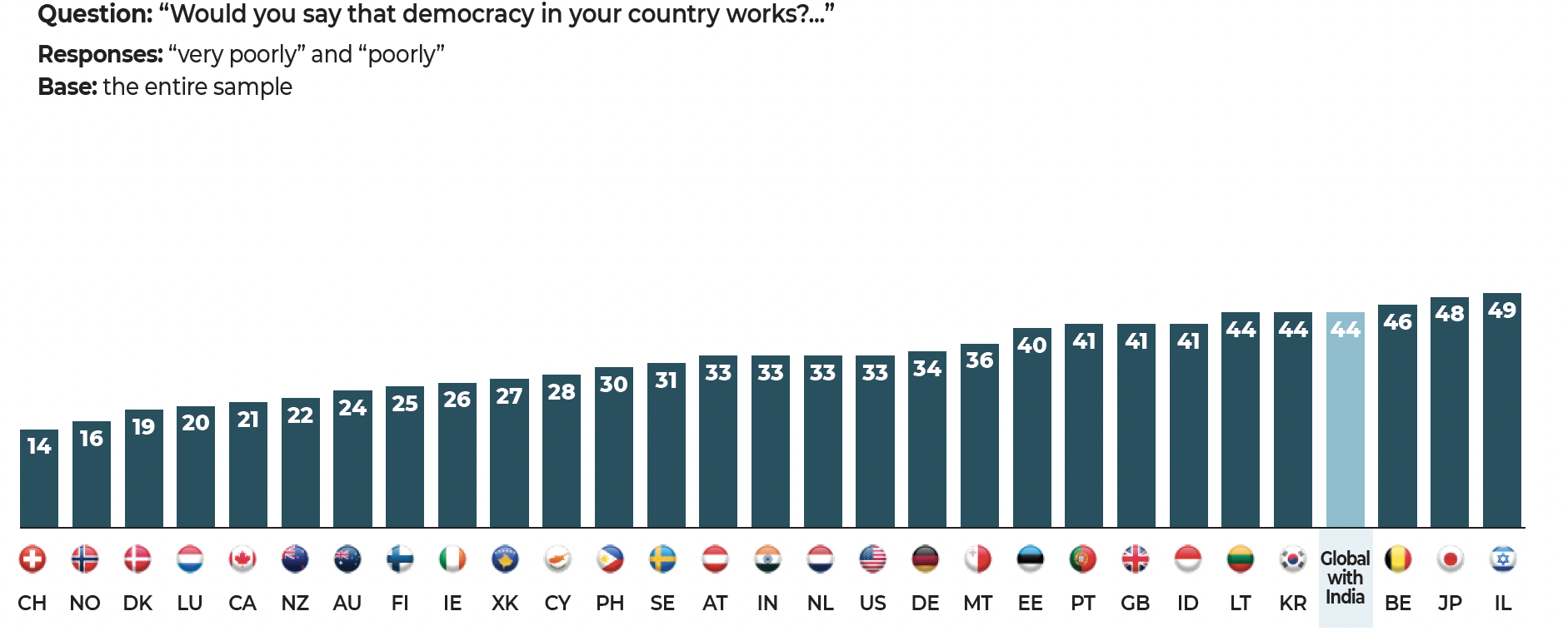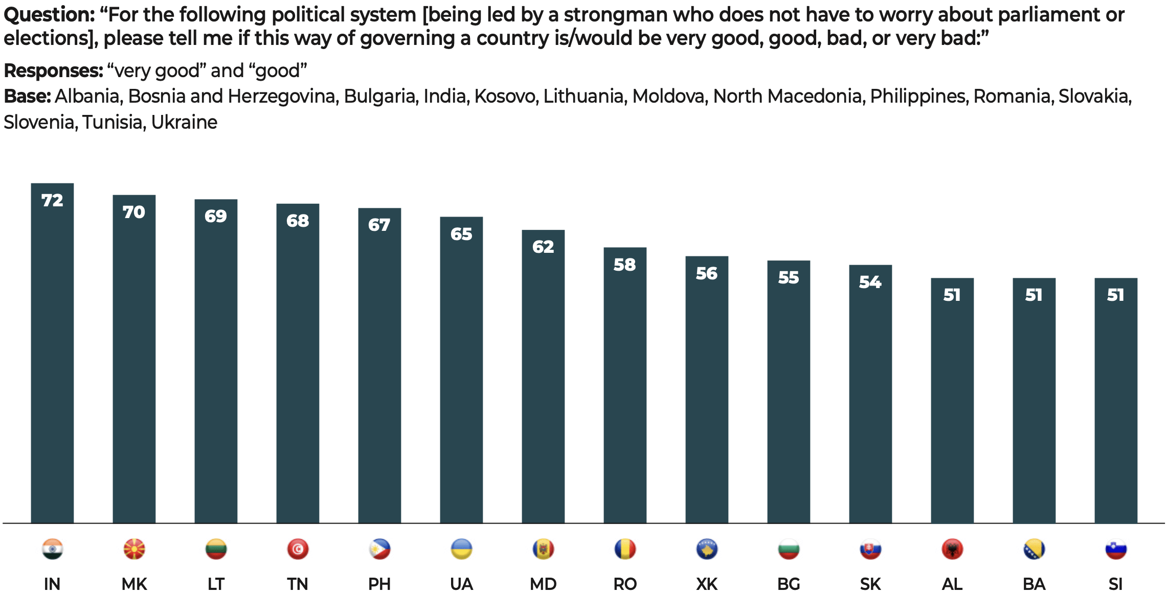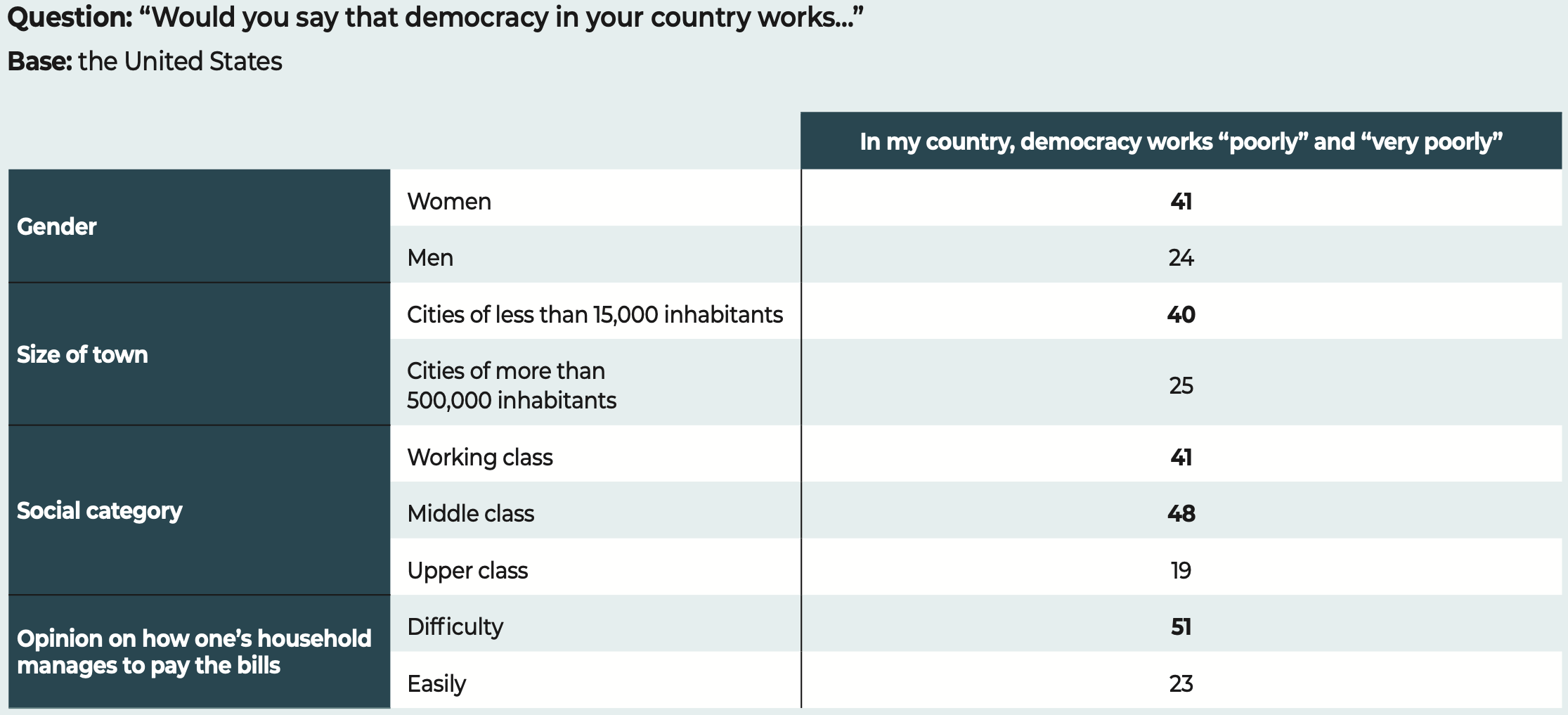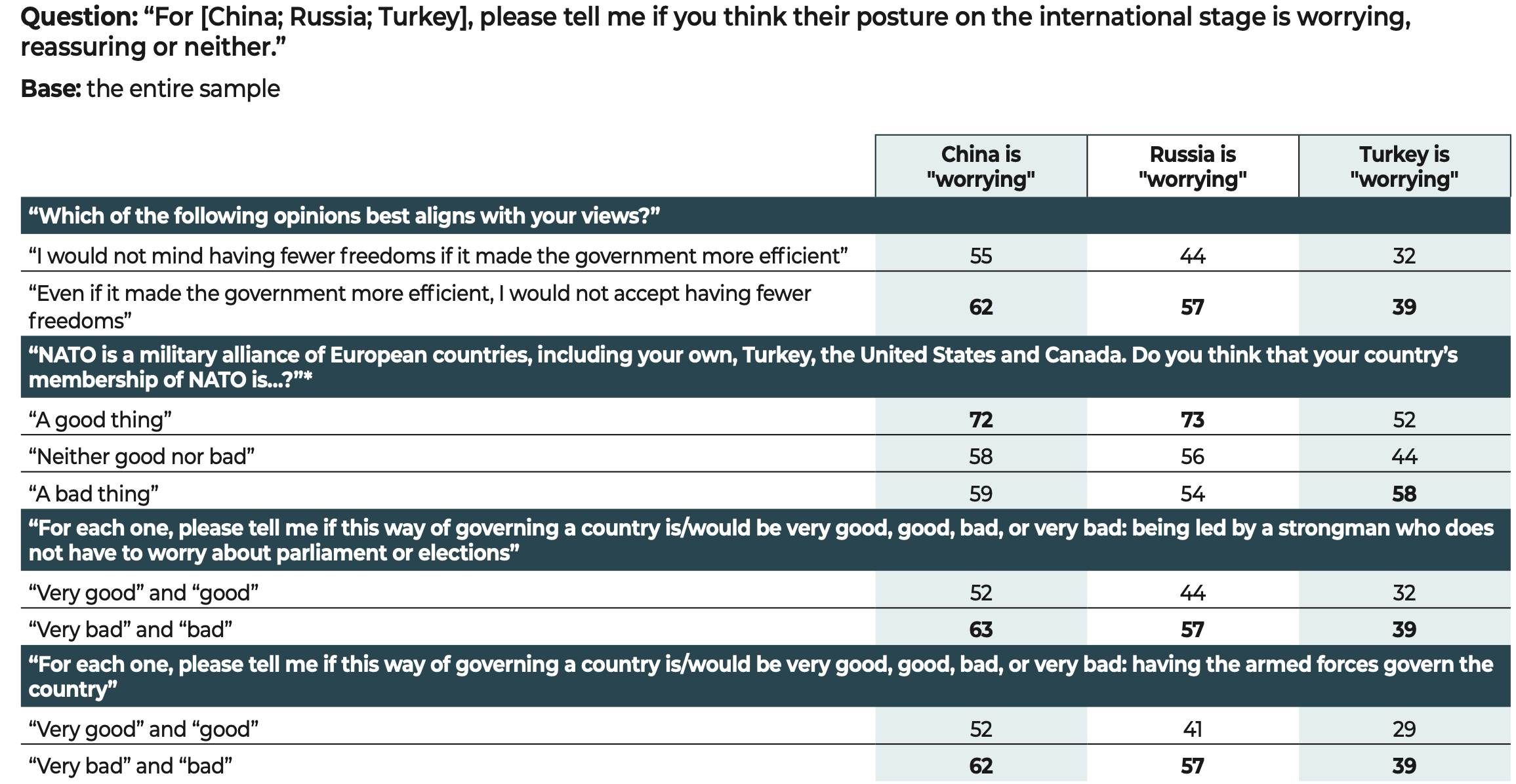 In the face of these major challenges, democratic societies still have one priceless asset that is illustrated in the results of our study. The citizens surveyed have confirmed their allegiance to freedoms and to democracy. Our data show that when they voice disapproval, more often than not, the object of their criticism is not the idea of democracy itself but rather the way in which democracy functions in their country.