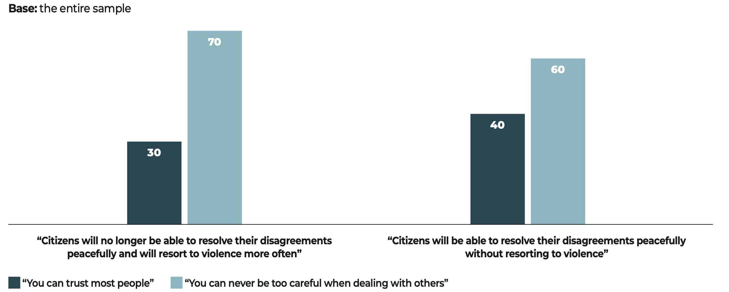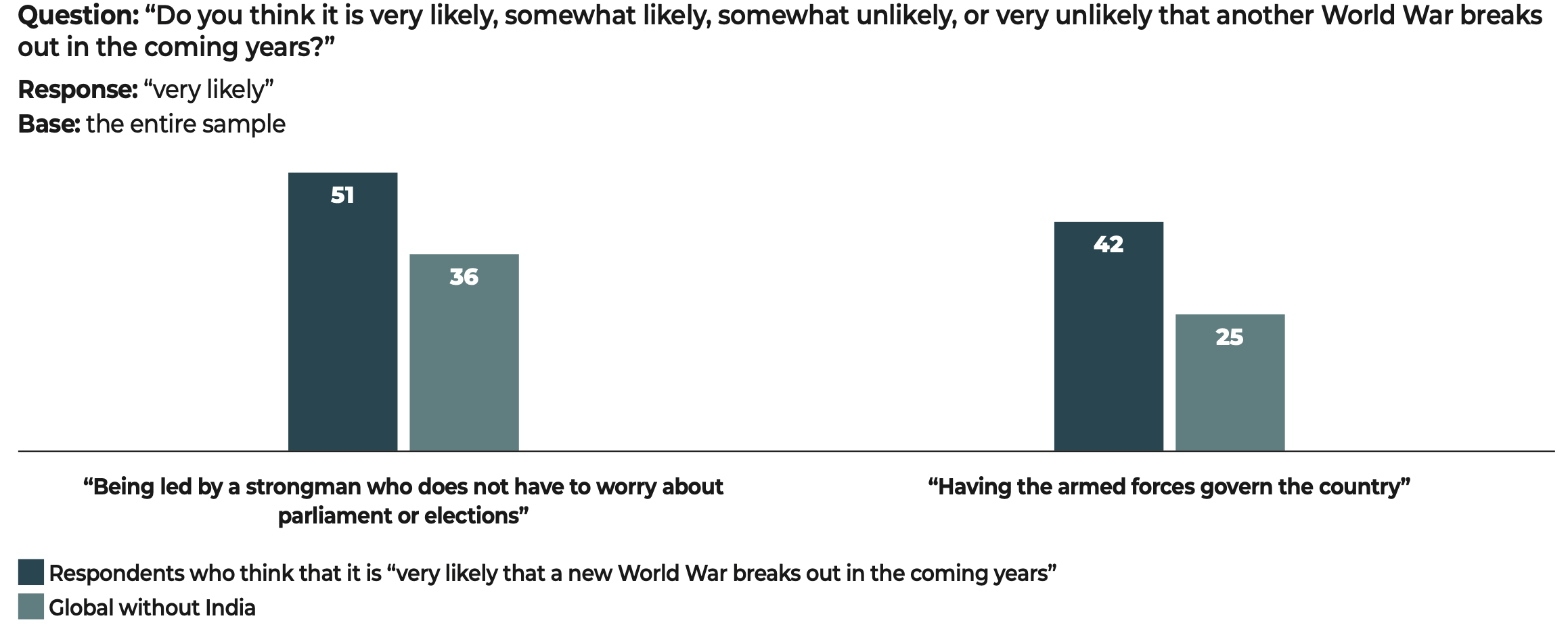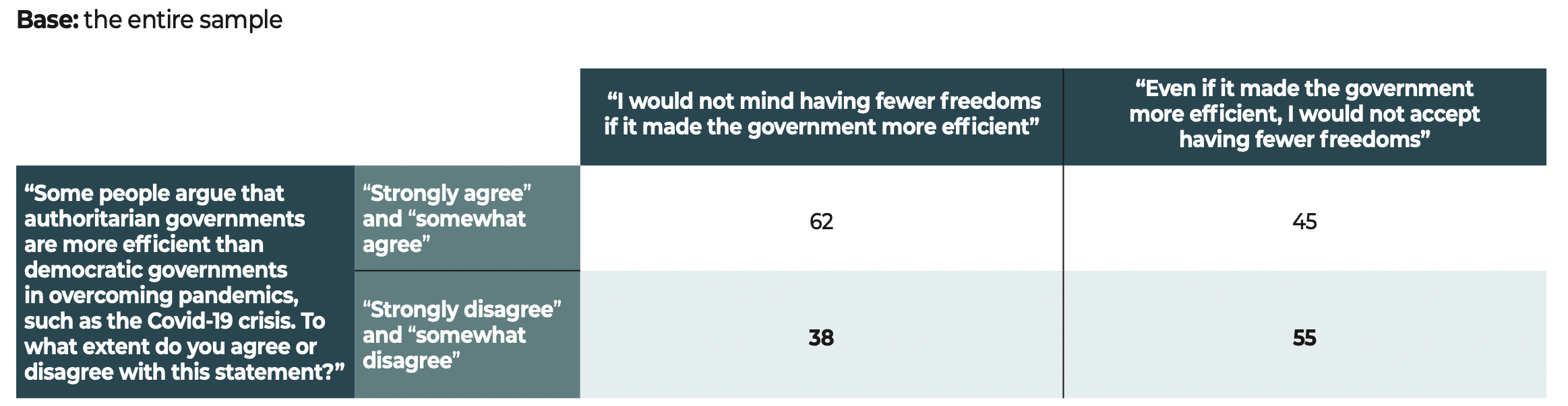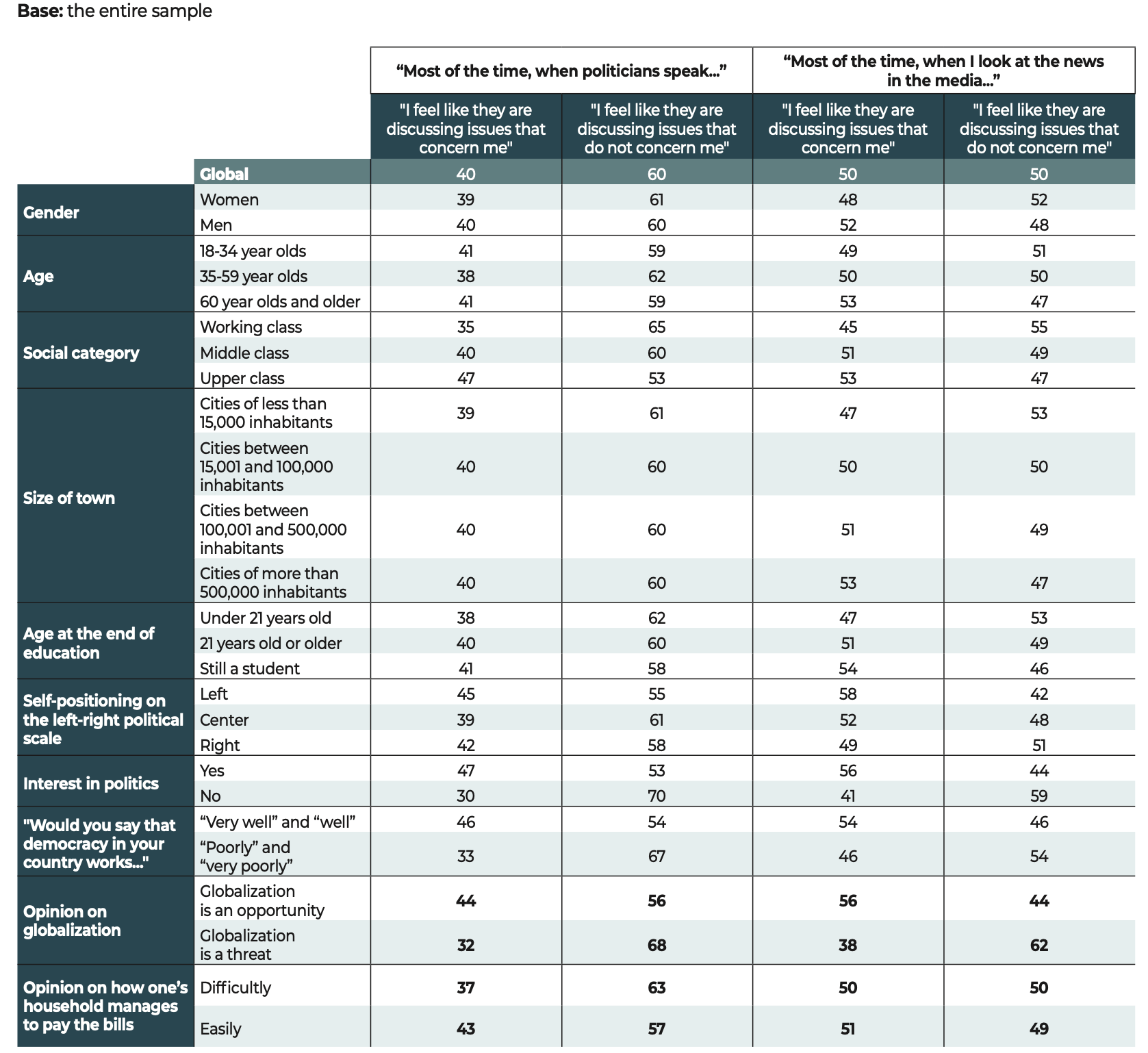 In the face of these major challenges, democratic societies still have one priceless asset that is illustrated in the results of our study. The citizens surveyed have confirmed their allegiance to freedoms and to democracy. Our data show that when they voice disapproval, more often than not, the object of their criticism is not the idea of democracy itself but rather the way in which democracy functions in their country.