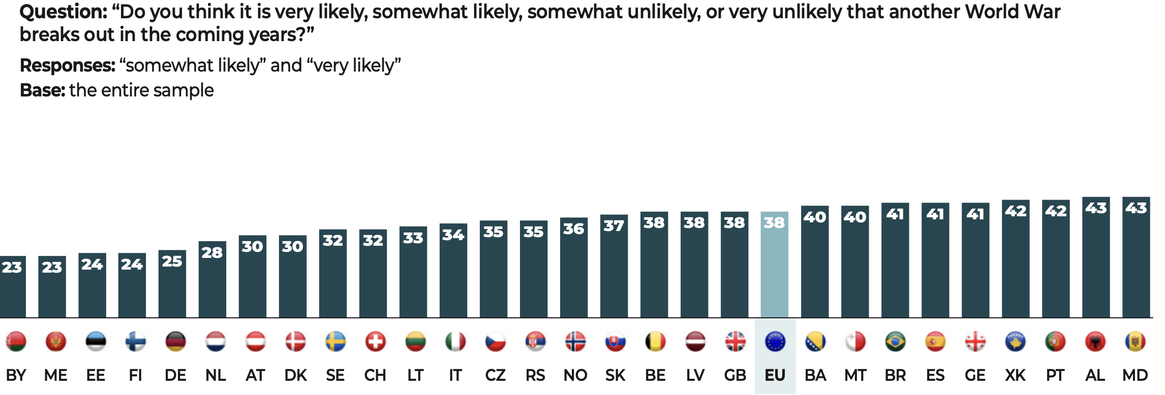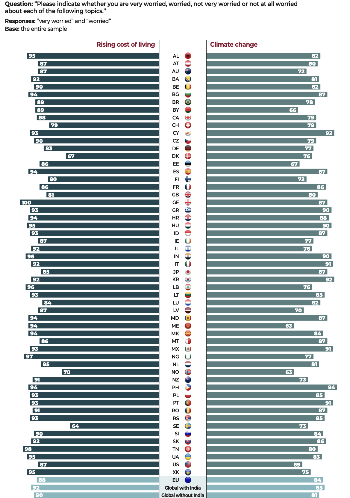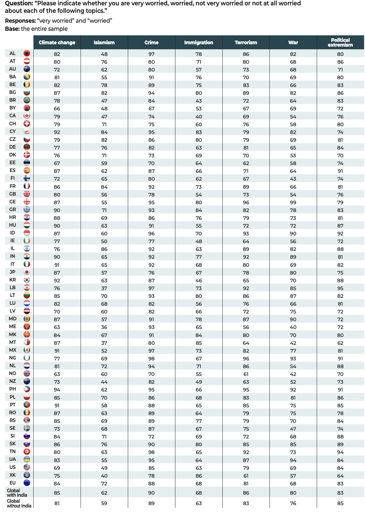 The questionnaire was administered to 47,408 people, in each of the national languages, i.e. 45 languages for 55 countries: Albania, Australia, Austria, Belarus, Belgium, Bosnia and Herzegovina, Brazil, Bulgaria, Canada, Croatia, Cyprus, the Czech Republic, Denmark, Estonia, Finland, France, Georgia, Germany, Greece, Hungary, India, Indonesia, Ireland, Israel, Italy, Japan, Kosovo, Latvia, Lebanon, Lithuania, Luxembourg, Malta, Mexico, Moldova, Montenegro, Netherlands, New Zealand, Nigeria, North Macedonia, Norway, Philippines, Poland, Portugal, Romania, Serbia, Slovakia, Slovenia, South Korea, Spain, Sweden, Switzerland, Tunisia, Ukraine, the United Kingdom and the United States.