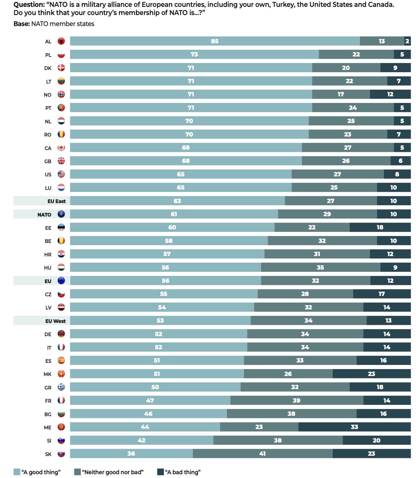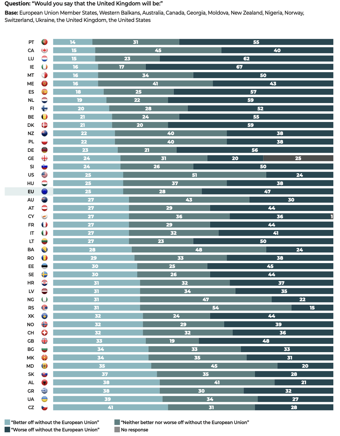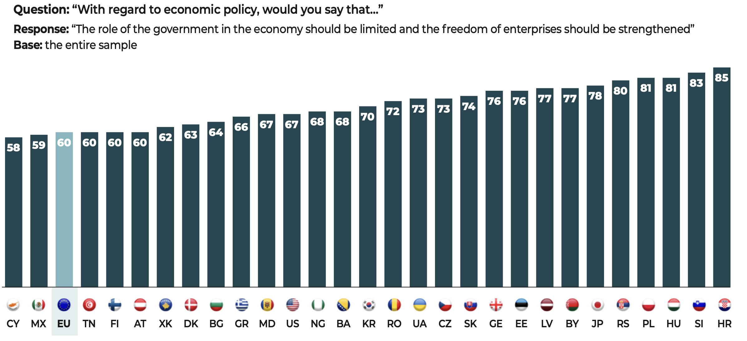 The questionnaire was administered to 47,408 people, in each of the national languages, i.e. 45 languages for 55 countries: Albania, Australia, Austria, Belarus, Belgium, Bosnia and Herzegovina, Brazil, Bulgaria, Canada, Croatia, Cyprus, the Czech Republic, Denmark, Estonia, Finland, France, Georgia, Germany, Greece, Hungary, India, Indonesia, Ireland, Israel, Italy, Japan, Kosovo, Latvia, Lebanon, Lithuania, Luxembourg, Malta, Mexico, Moldova, Montenegro, Netherlands, New Zealand, Nigeria, North Macedonia, Norway, Philippines, Poland, Portugal, Romania, Serbia, Slovakia, Slovenia, South Korea, Spain, Sweden, Switzerland, Tunisia, Ukraine, the United Kingdom and the United States.