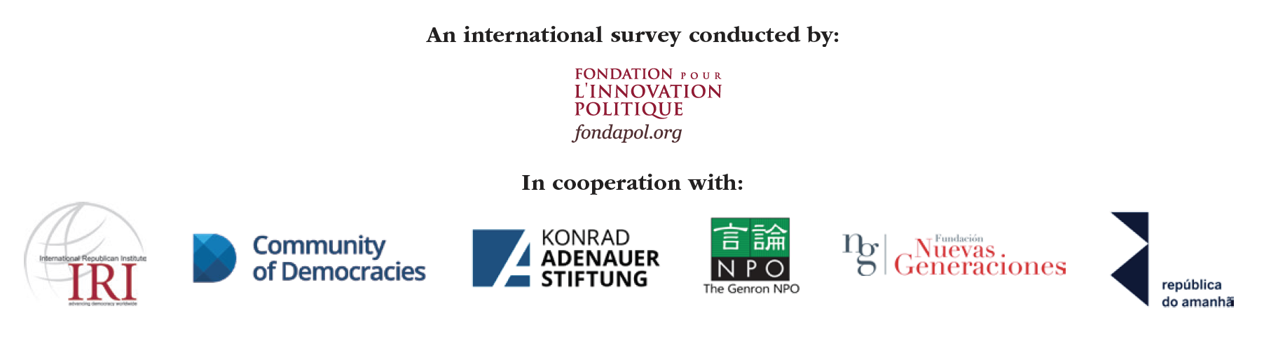 This is the troubled context within which we have created the global survey Freedoms at risk: the challenge of the century. This survey was born out of close cooperation between the Fondation pour l’innovation politique (France), the International Republican Institute (the U.S.), the Community of Democracies (intergovernmental organization), the Konrad-Adenauer-Stiftung (Germany), the Genron NPO (Japan), the Fundación Nuevas Generaciones (Argentina) and República do Amanhã (Brazil).