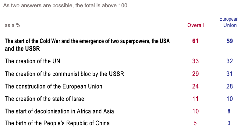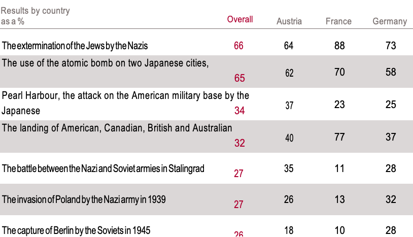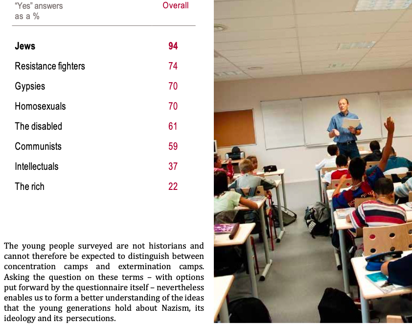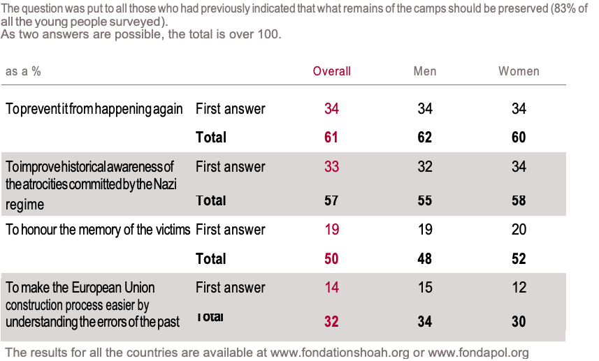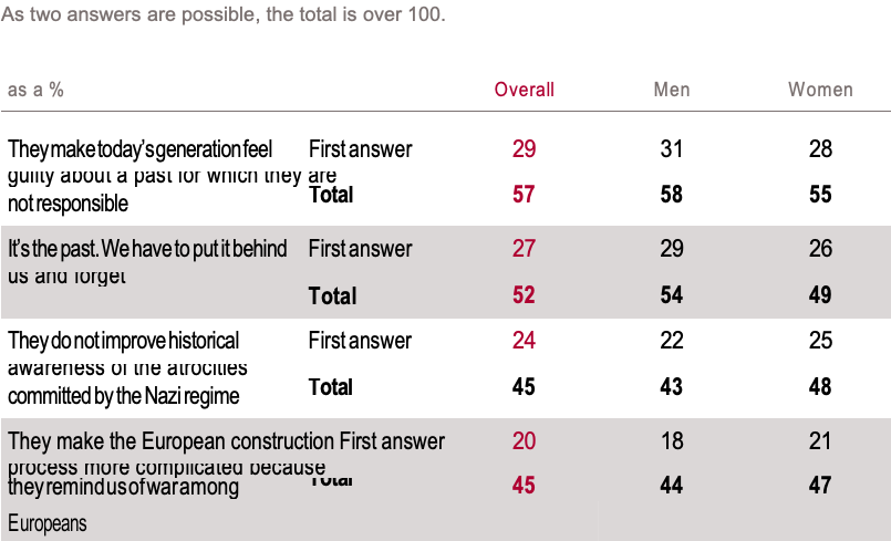 Finally, it will be noted that the idea that preserving the camps may “make the European construction process more complicated because they remind us of war among Europeans” is no more widely cited in Europe (42%) than it is among the respondents overall (45%).