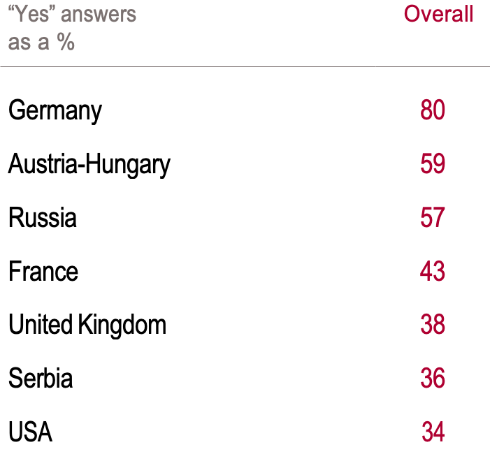 The Japanese stand out in the way they seem to consider every country to have been responsible for the Great War: Germany (70%), Russia and the UK (66% in both cases), the USA (62%), France (57%), Austria-Hungary (52%) and Serbia (49%).
