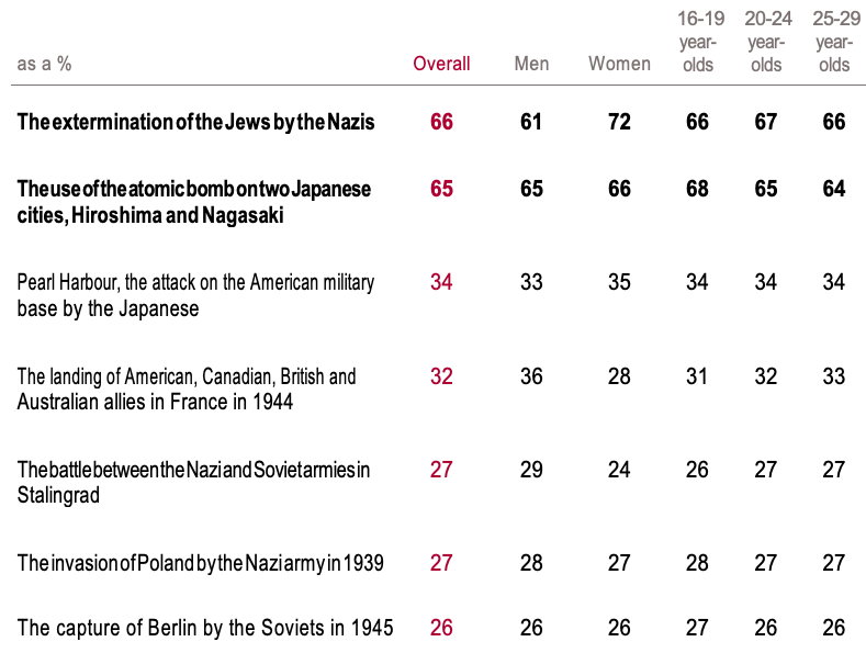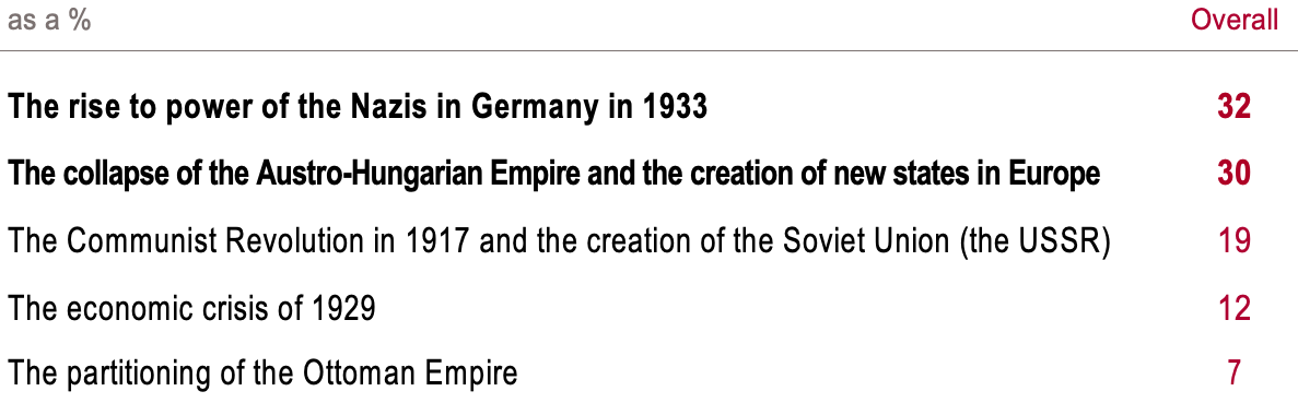 For a third of the young people surveyed (32%), the Nazi ascent to power in Germany in 1933 is one of the main consequences of the First World War. More than a half of young Britons are of this opinion (54%), as are nearly half of the Americans (48%), 44% of Israelis, 41% of Australians, Canadians, French and Germans, and 40% of Belgians and Japanese.