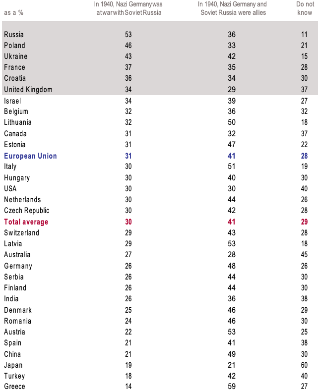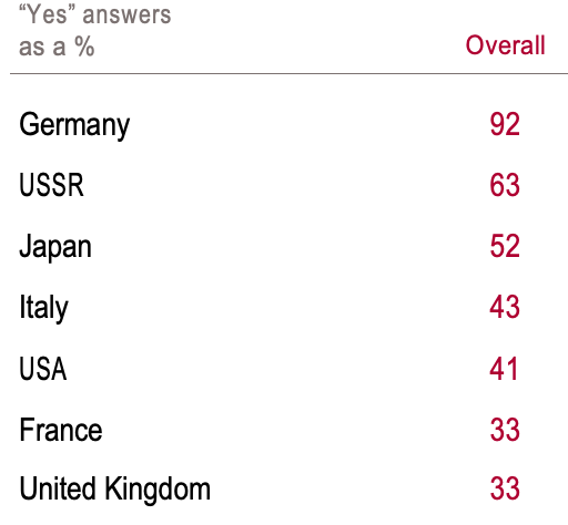 By and large, the same reasons can be used to explain why the proportion of those surveyed who consider the British political system not to have respected freedom and human dignity between 1939 and 1945 can reach 62% in Japan, 61% in Turkey, 49% in Serbia, 45% in Greece and India, and 38% in Croatia and Spain. The tight sense of military collaboration