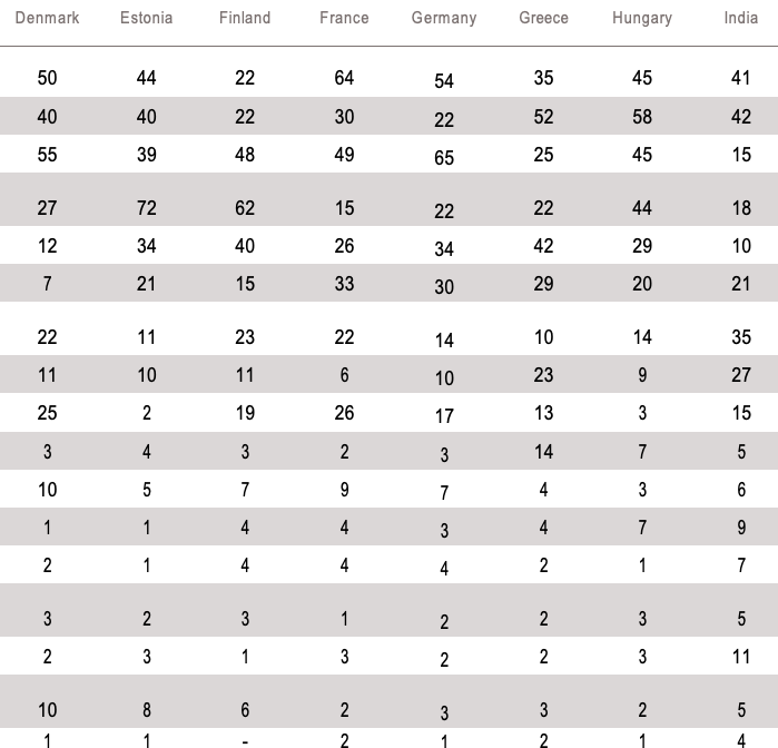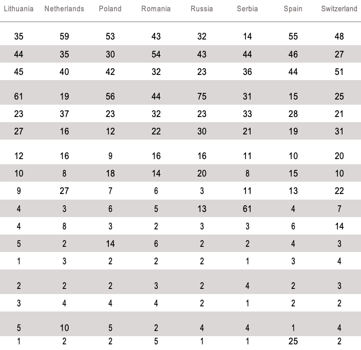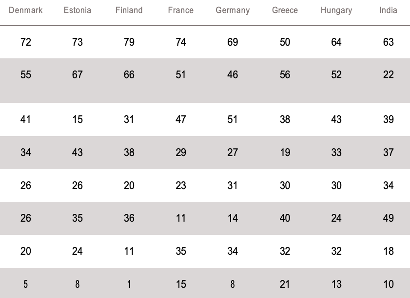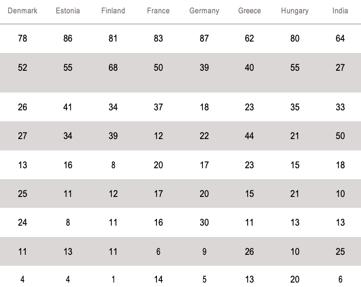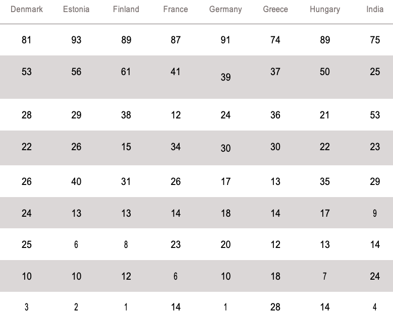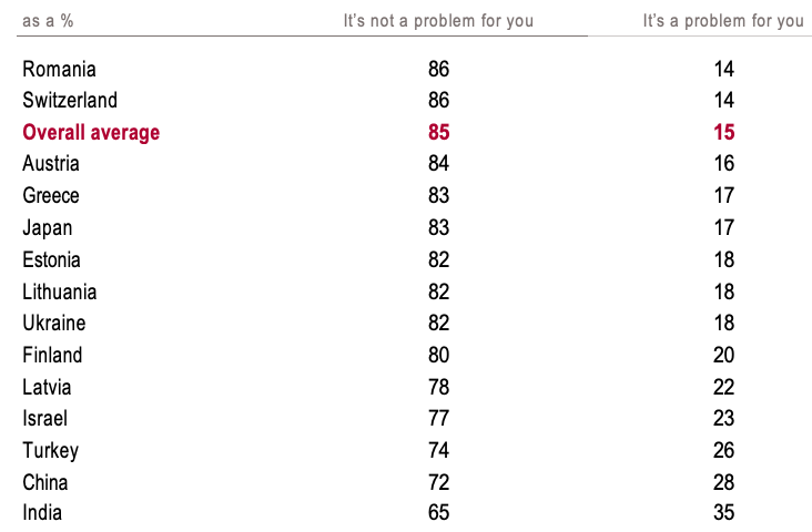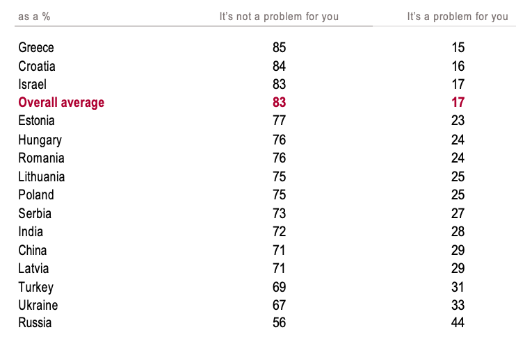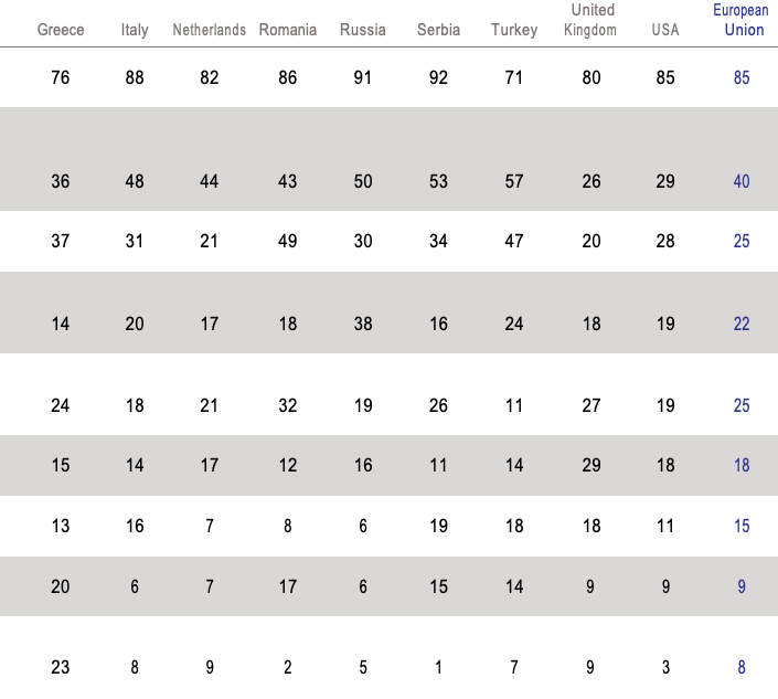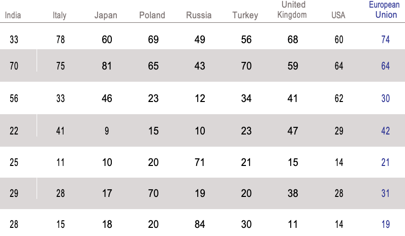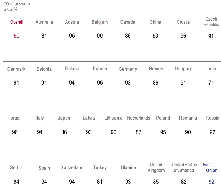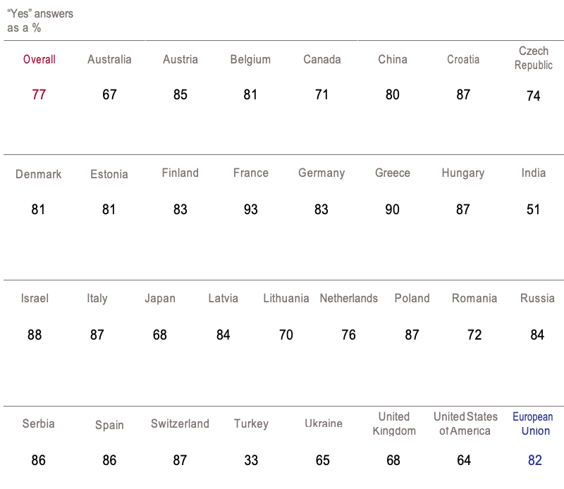 The 31 countries in the survey are: Australia, Austria, Belgium, Canada, China, Croatia, the Czech Republic, Denmark, Estonia, Finland, France, Germany, Greece, Hungary, India, Israel, Italy, Japan, Latvia, Lithuania, the Netherlands, Poland, Romania, Russia, Serbia, Spain, Switzerland, Turkey, Ukraine, the United Kingdom and the United States.