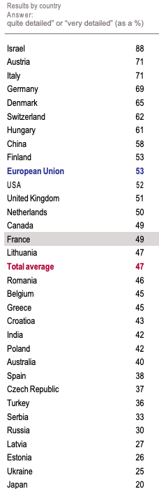 It will be noted that many more Chinese (59%) and Indians (58%) believe themselves to be well-informed than Americans (36%), but that the Japanese (79%), the Czechs (76%), the Estonians (75%), the Dutch (73%), the Latvians (73%), the Ukrainians (73%), the Russians (69%) and the Spanish (68%) are those who most frequently claim to be poorly informed on this matter.