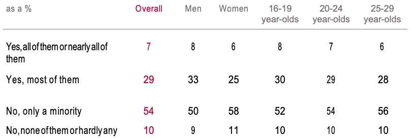 The members of each group share a collection of experiences. And this particular generation seems to demonstrate a set of common values and behaviours, perhaps as a result of these experiences. The values and preferences that emerge from the answers to our questions are not, of course, necessarily backed up by everyday actions. For example, even if the respondents profess here their agreement with the opinion that men and women are equal, it does not automatically mean that their behaviour is never