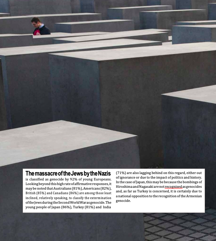 The survey was designed by the Fondation pour l’innovation politique and the Fondation pour la Mémoire de la Shoah. It was carried out by the Ipsos institute, which surveyed 31.172 people in national samples of roughly 1.000 individuals, aged between 16 and 29 years. The questionnaire was taken to 31 countries, and in doing so was translated into each of the different national languages (24 in total). It consisted of 33 questions. The collection of the data was carried out over a four-week period (14th July to 11th August 2014) in order to neutralise the effects of changing present day circumstances. A quota system for the respondents’ age, sex and place of residency was used to ensure that the samples were representative of a cross-section of society. However, as the survey was distributed as an electronic questionnaire, the samples from emerging countries are more representative of middle-class and well-off sections of the population.