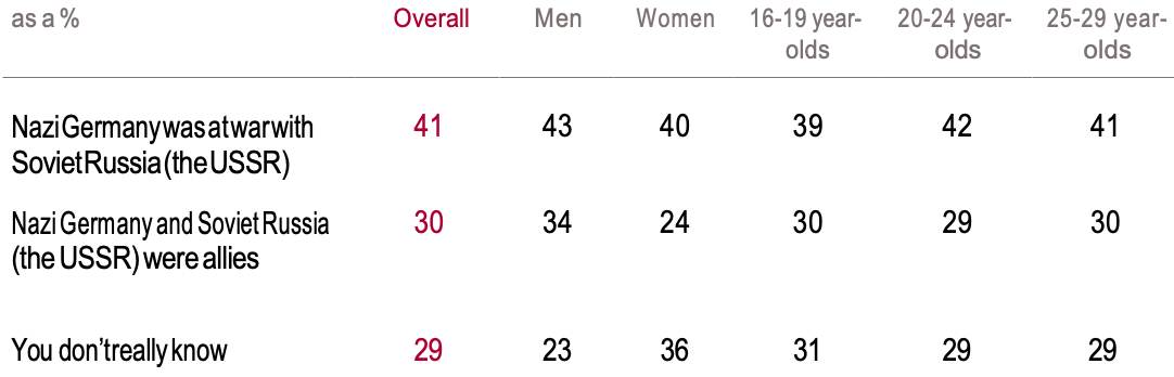 Further east, young people still largely point towards the fall of the Soviet Union and the collapse of communism in 1991 as being the most important events: this is the case in Russia, (75%), Estonia (72%), Ukraine (68%), Latvia (64%), Finland (62%), Lithuania (61%), Poland (56%) and theCzech Republic (53%).
