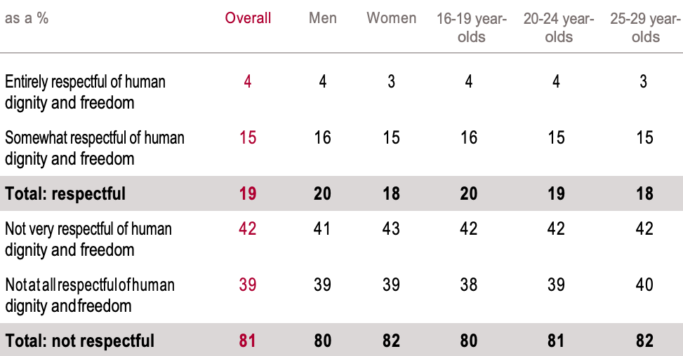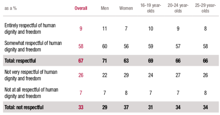 « In your view, during the Second World War between 1939 and 1945, was the political system of the United Kingdom entirely respectful of human dignity and freedom, somewhat respectful of human dignity and freedom, not very respectful of human dignity and freedom, or not at all respectful of human dignity and freedom? »
