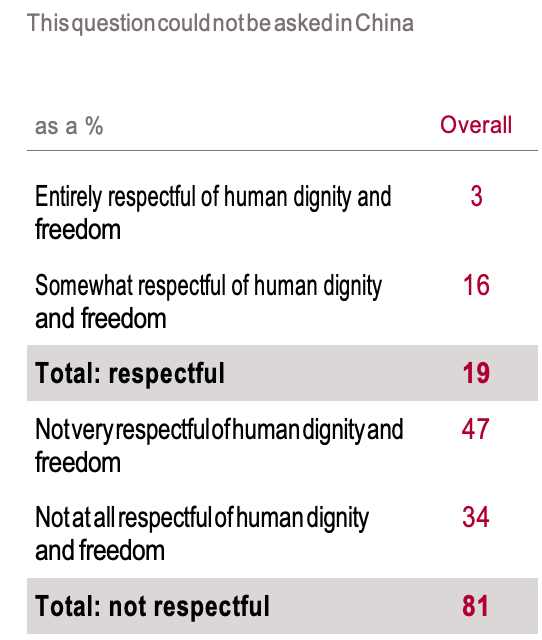 « In your view, was the political system of China under Mao from 1949 to 1976 entirely respectful of human dignity and freedom, somewhat respectful of human dignity and freedom, not very respectful of human dignity and freedom, or not at all respectful of human dignity and freedom? »