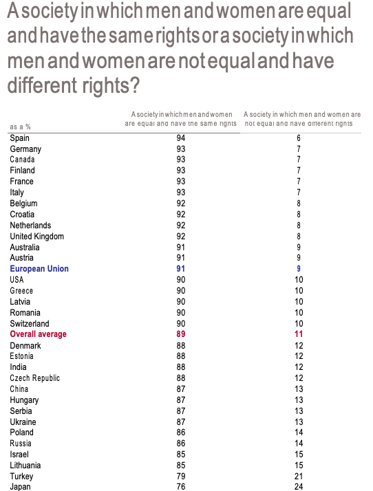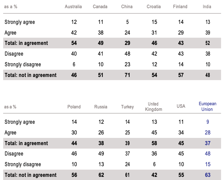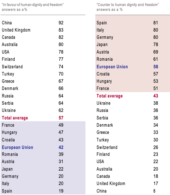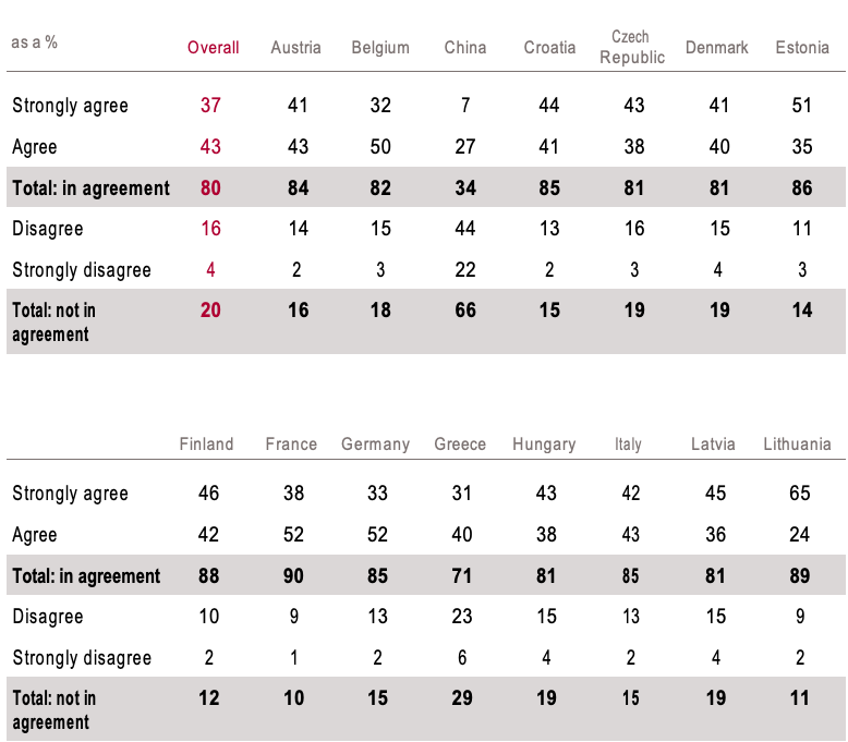 The Chinese were the only respondents to express a view to the contrary. Yet a third among them still indicated their agreement with this statement (34%). The fact that this question could be put to the Chinese, and the result obtained from it, are two of the most striking features of our survey.