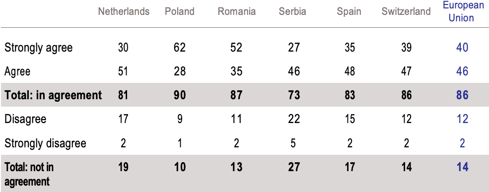 The importance of family members, cited by 18% of the respondents, is most frequently underlined by the Greeks, Poles, Lithuanians and Ukrainians (23%), the Dutch (24%), the Romanians (26%) and the Israelis (32%).