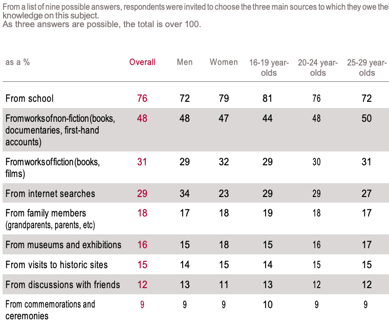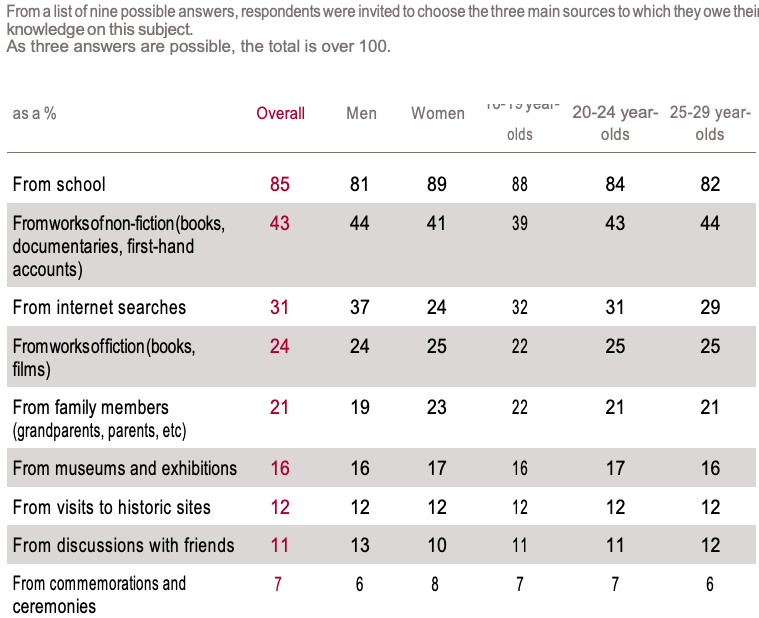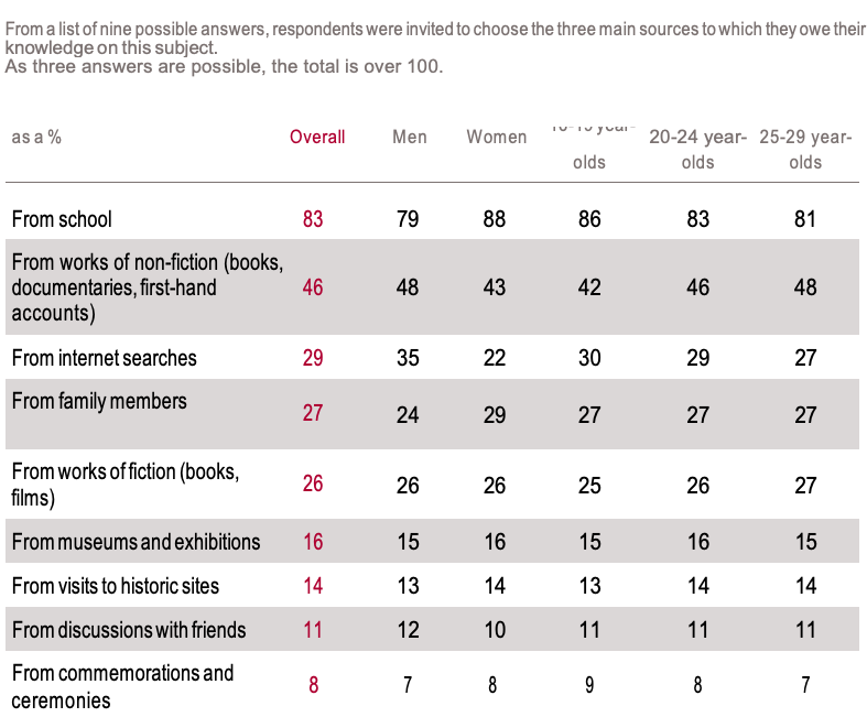 We also surveyed them about the sources of their historical knowledge, about the role played by school, by books, by fiction or documentaries, but also by family members or the internet, and even about the value of memorials, the pertinence of commemorations.