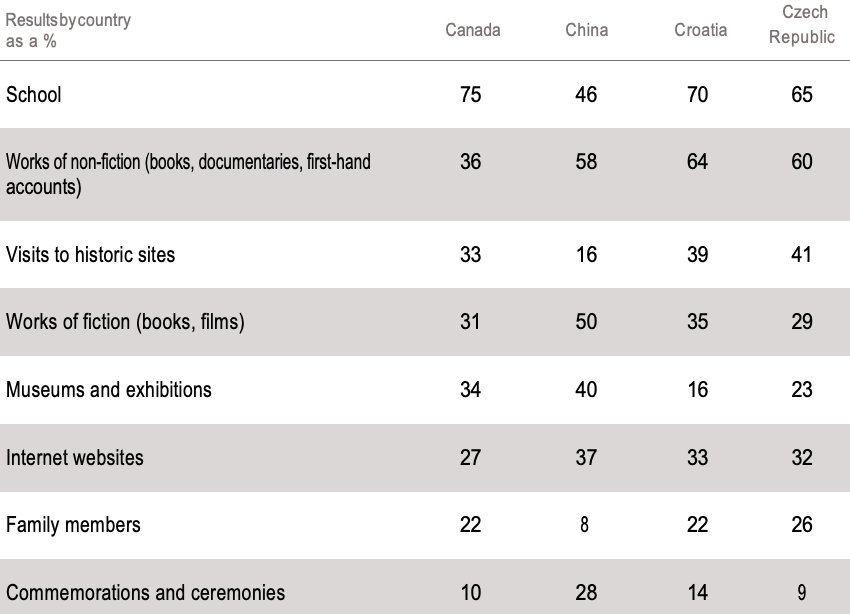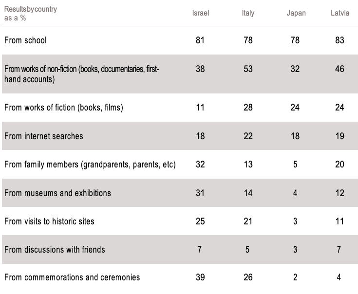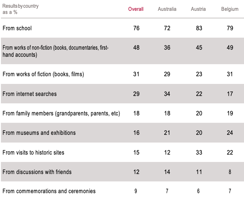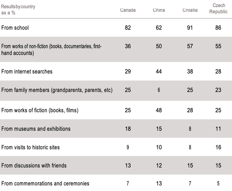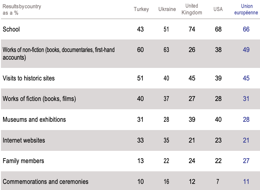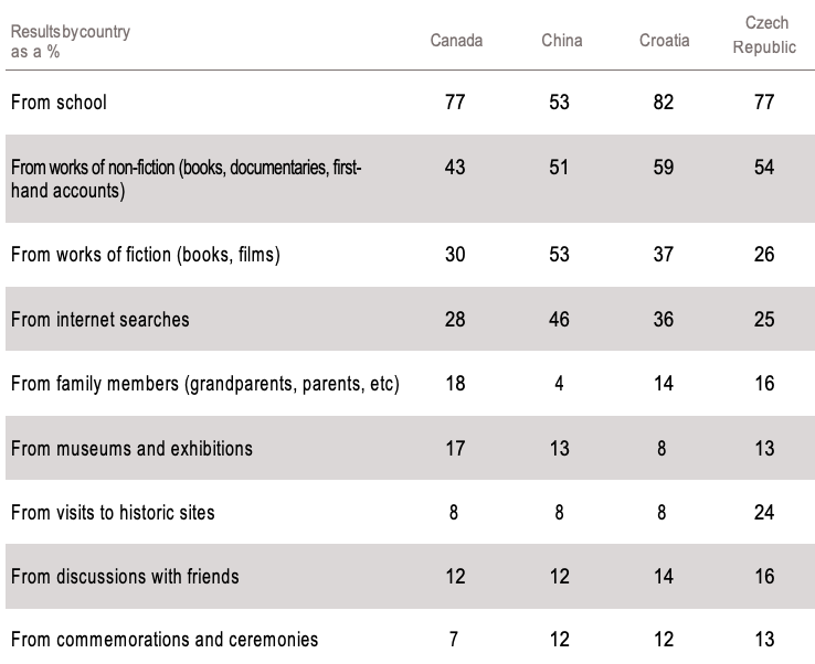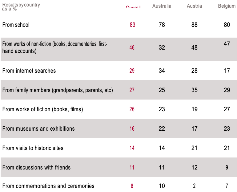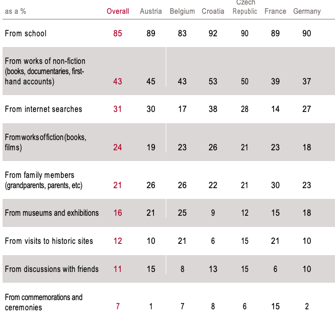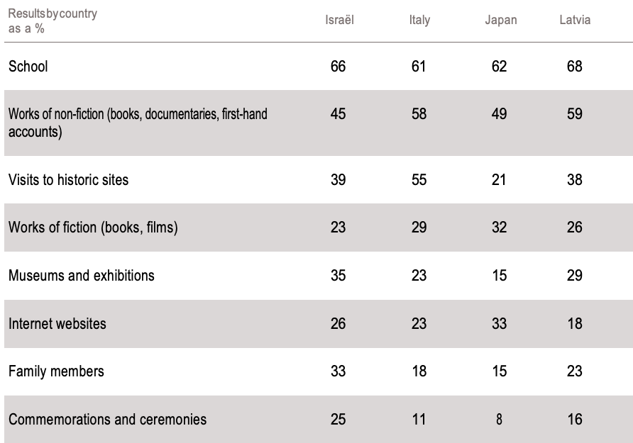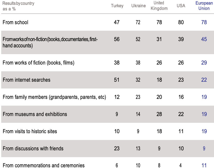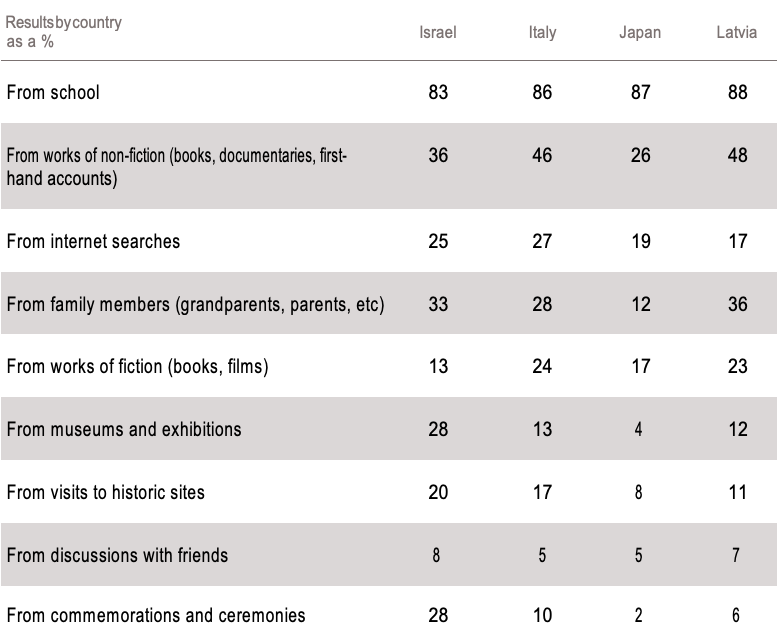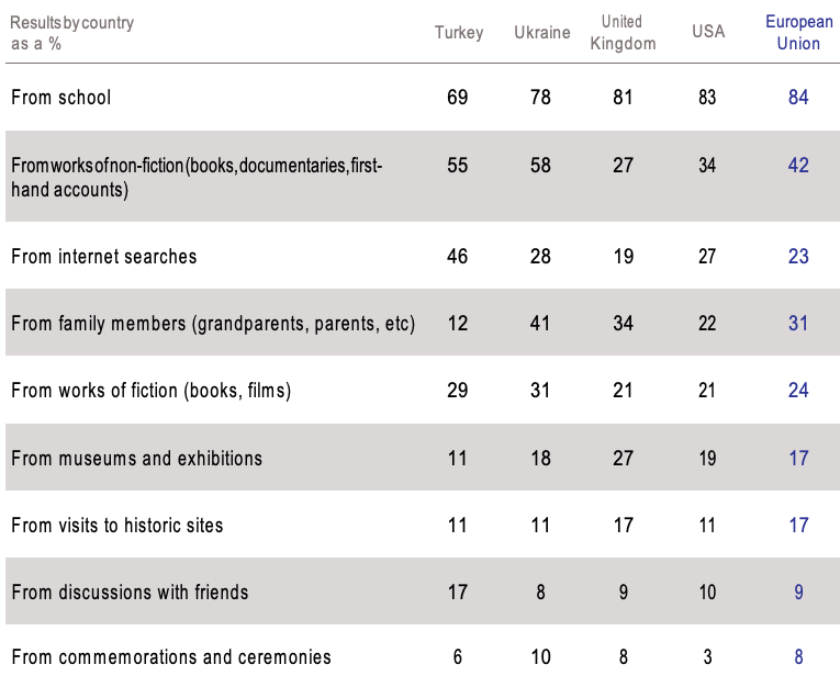 The differences in the responses provide evidence of a unique culture and history in each country. As such, schooling is ranked as the single main source of knowledge about the extermination of the Jews during the Second World War by all but one of the countries, Turkey, where young people instead cite non-fiction works (56%) and internet research (51%), with school (47%) only arriving in third place.